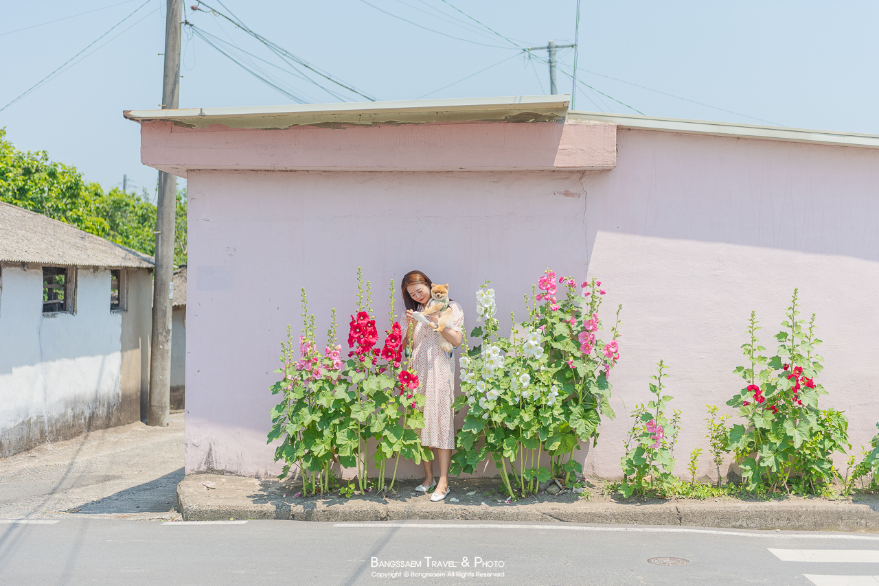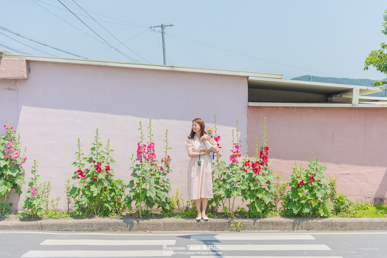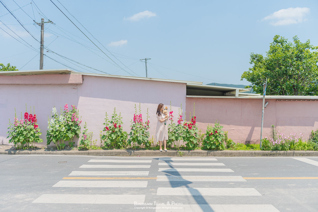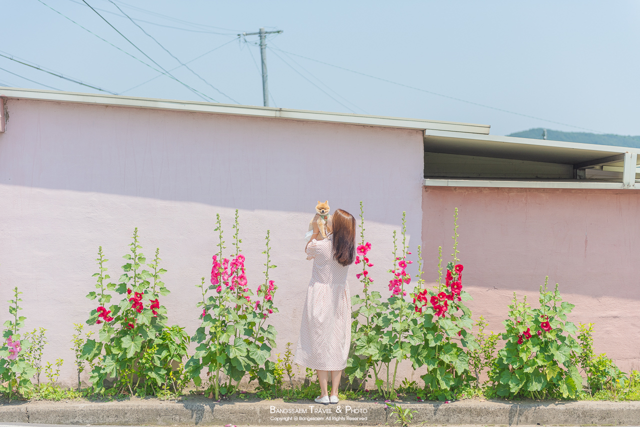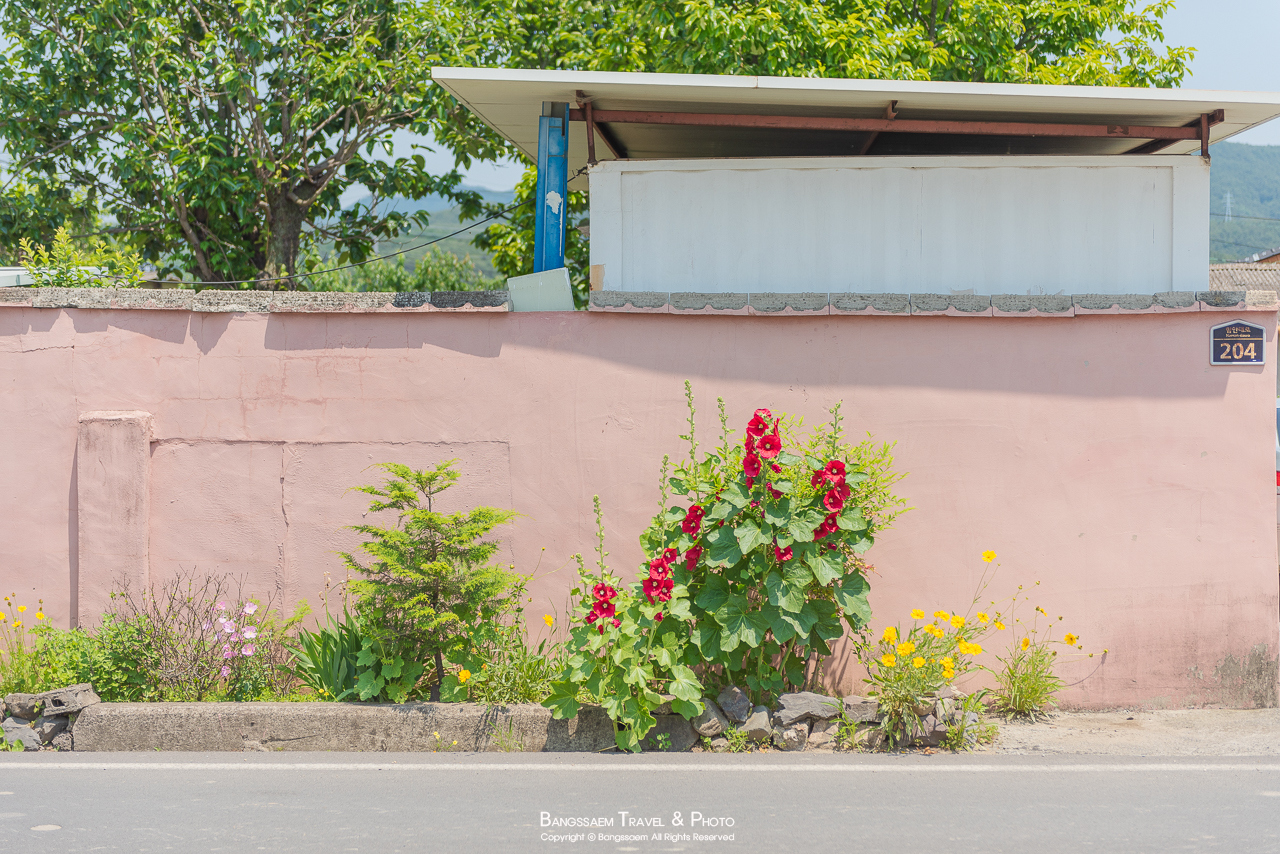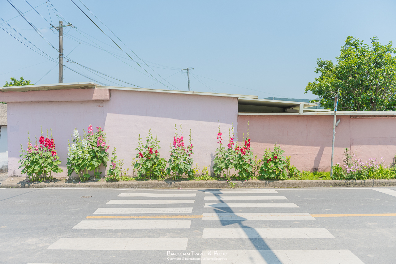 분홍색 담벼락 아래 옹기종기 피어있는 접시꽃. 벽의 색이 너무 예쁜 곳이다.