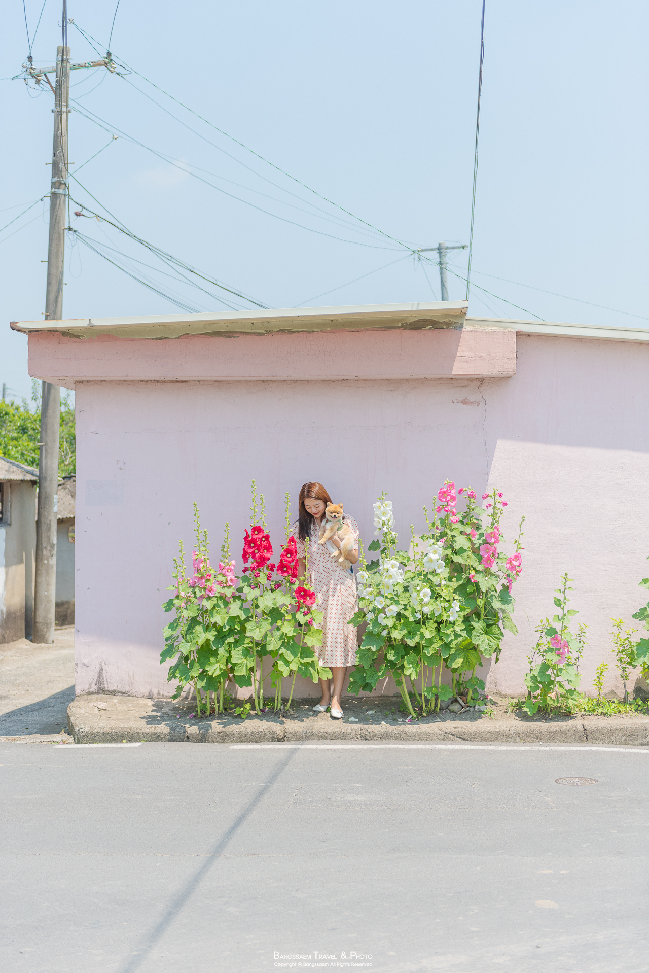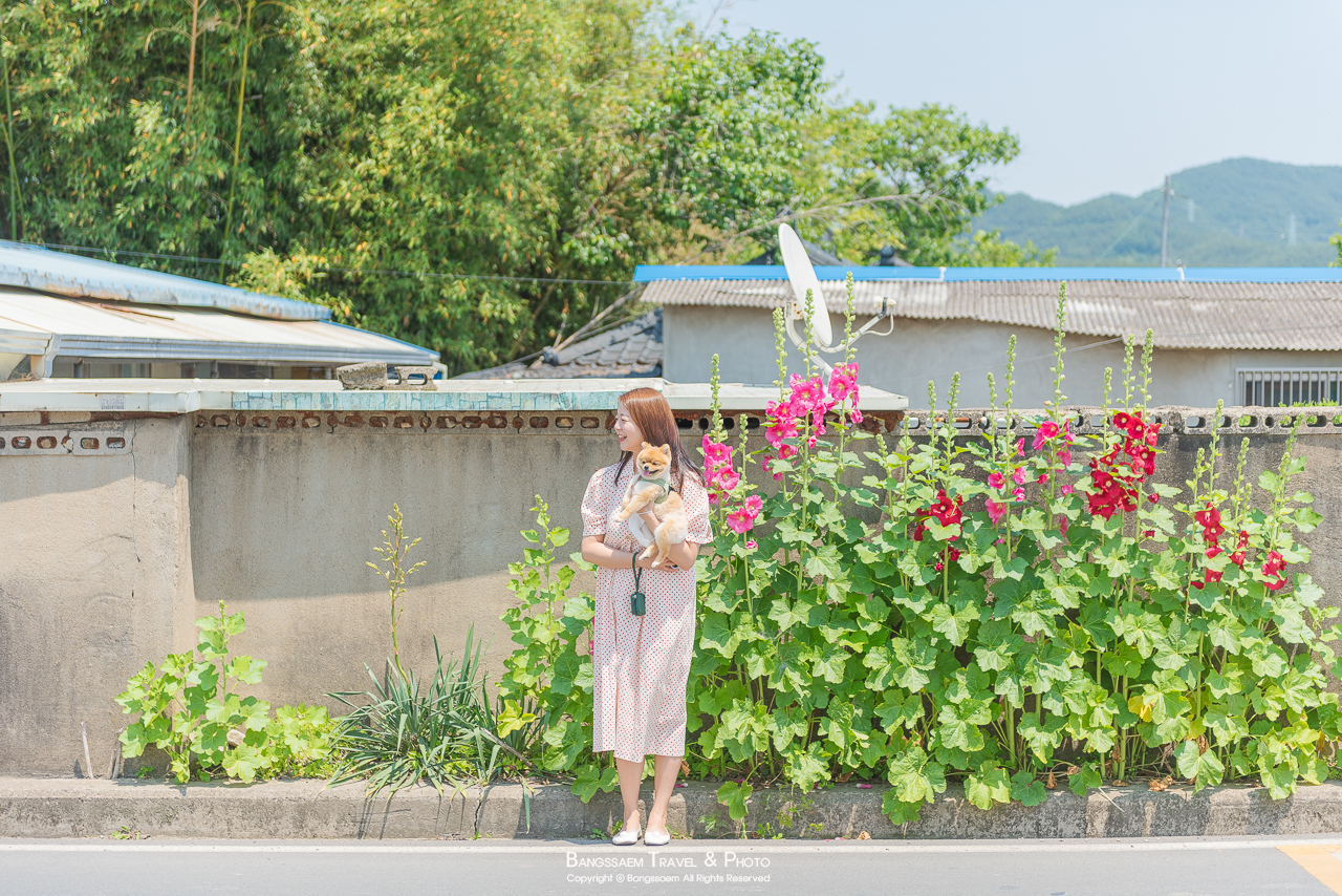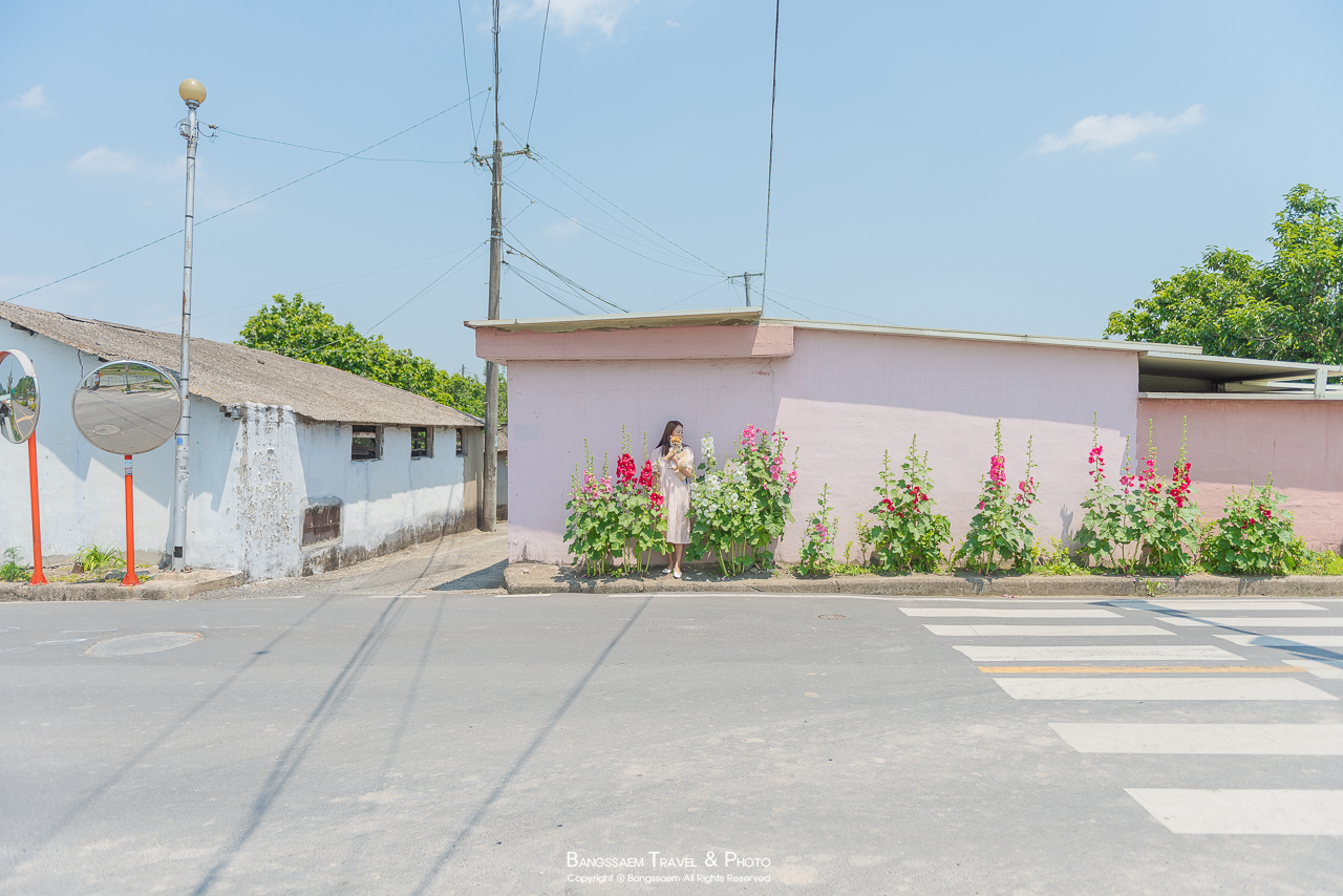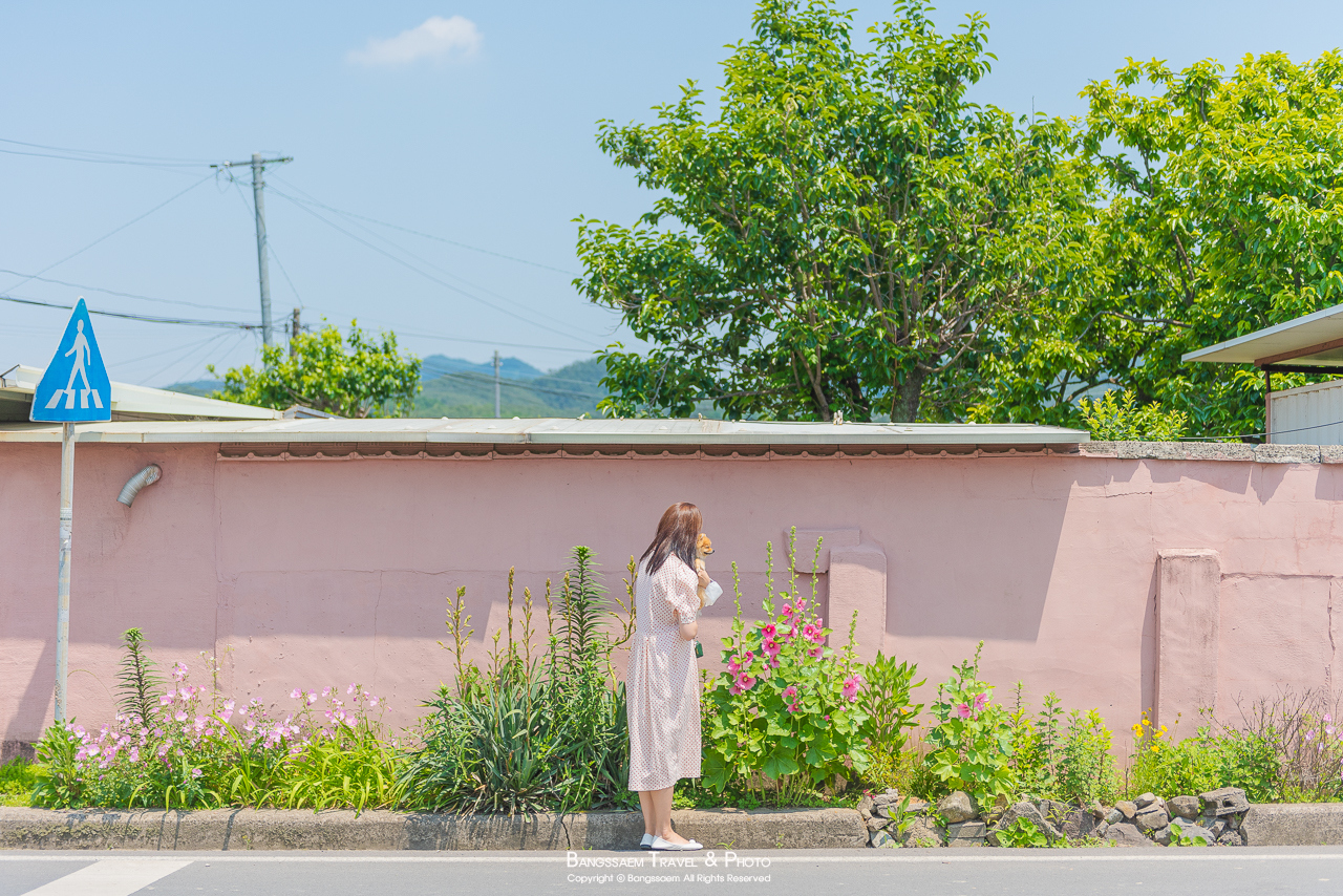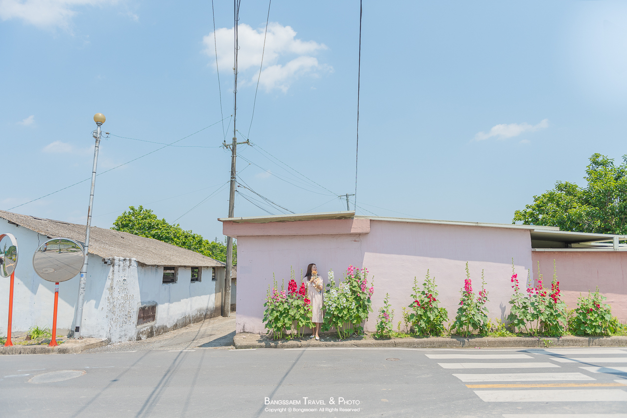 분홍색 담벼락 아래 옹기종기 피어있는 접시꽃. 벽의 색이 너무 예쁜 곳이다.