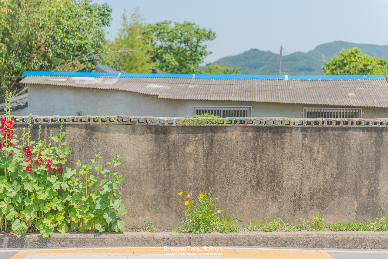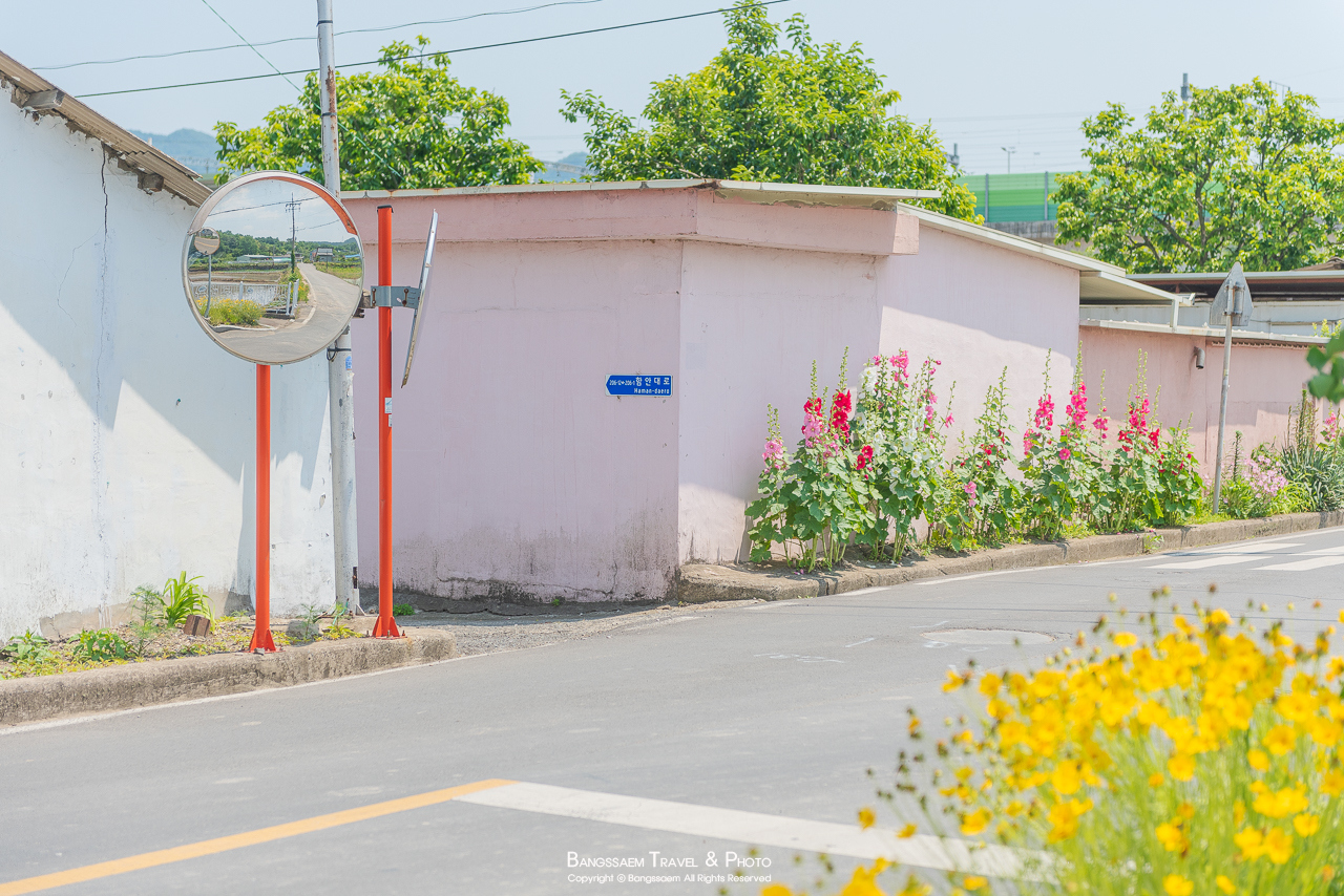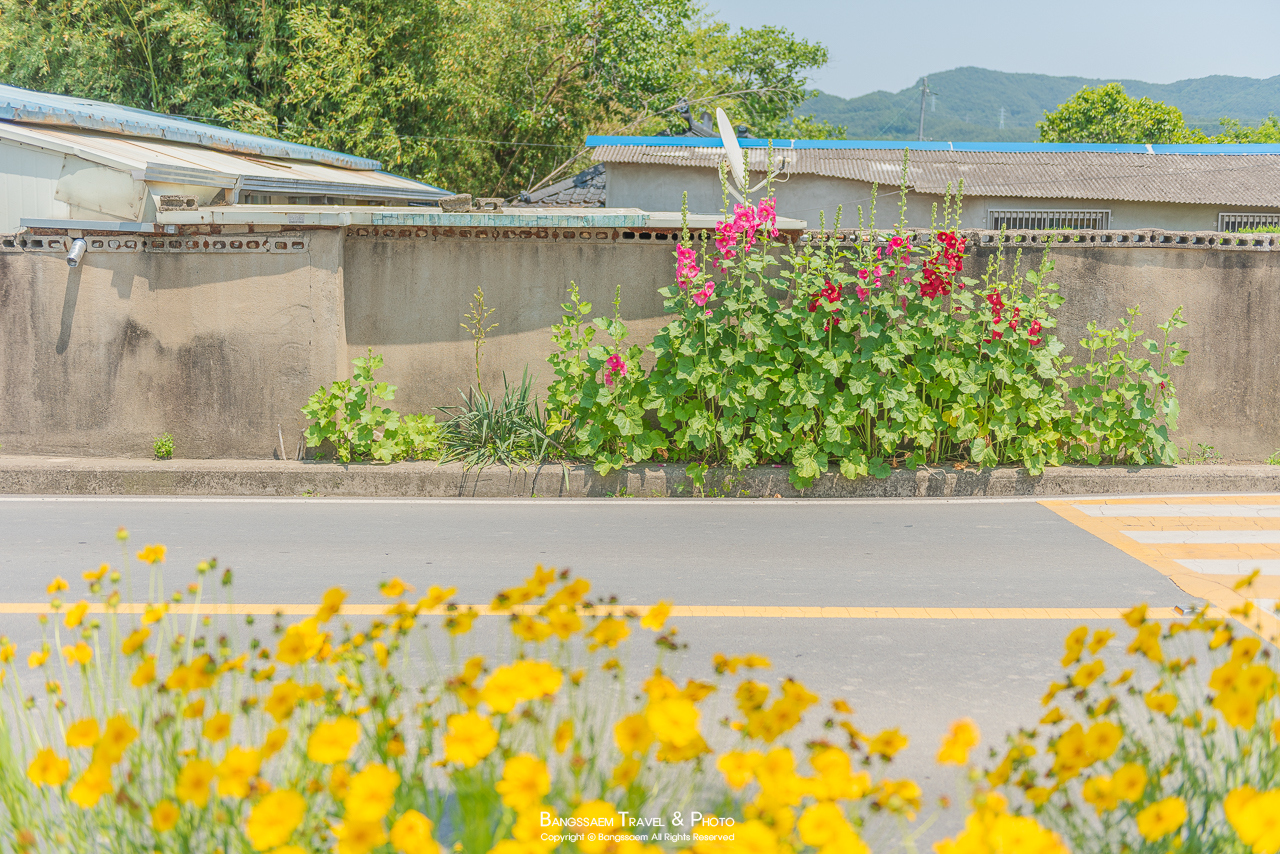 신개마을은 함안역 바로 옆에 있는 작은 마을이다. 그런데 이 작은 마을이 너무 예쁘다. 버스 정류장에는 금계국이 가득 피어있고, 핑크색, 하늘색 집들 앞에는 접시꽃이 옹기종기 피어있다. 작년에는 함안역 뒤에도 접시꽃들이 정말 많이 피었었는데 올해는 전혀 심지 않은 것 같다. 조금 아쉬운 마음이 든다.