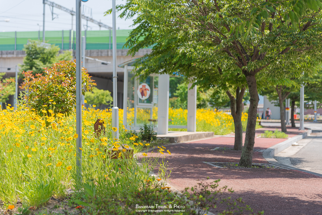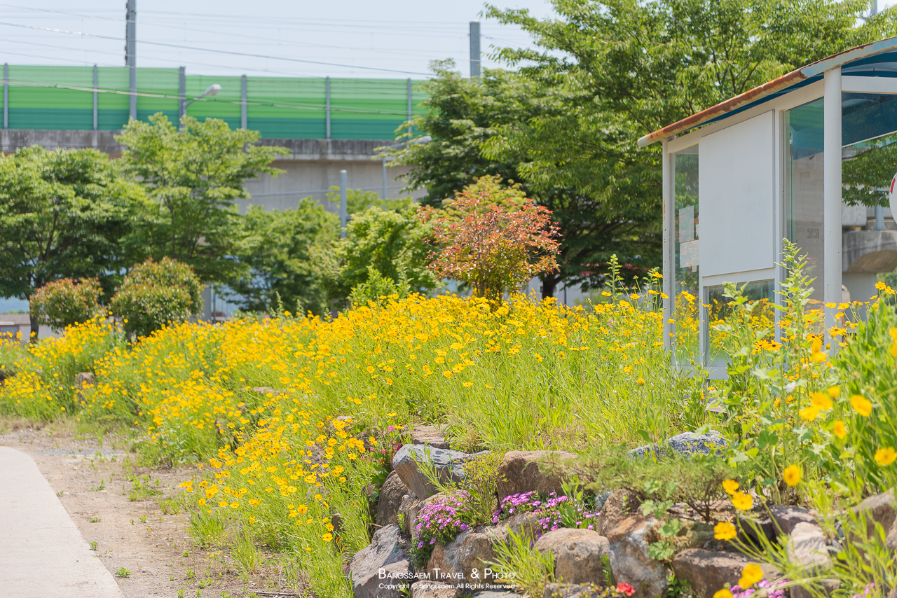 버스 정류장 주변으로는 금계국, 리빙스턴데이지, 그리고 루드베키아 등 다양한 꽃들이 활짝 피어있다. 이렇게 예쁜 버스 정류장이라니.