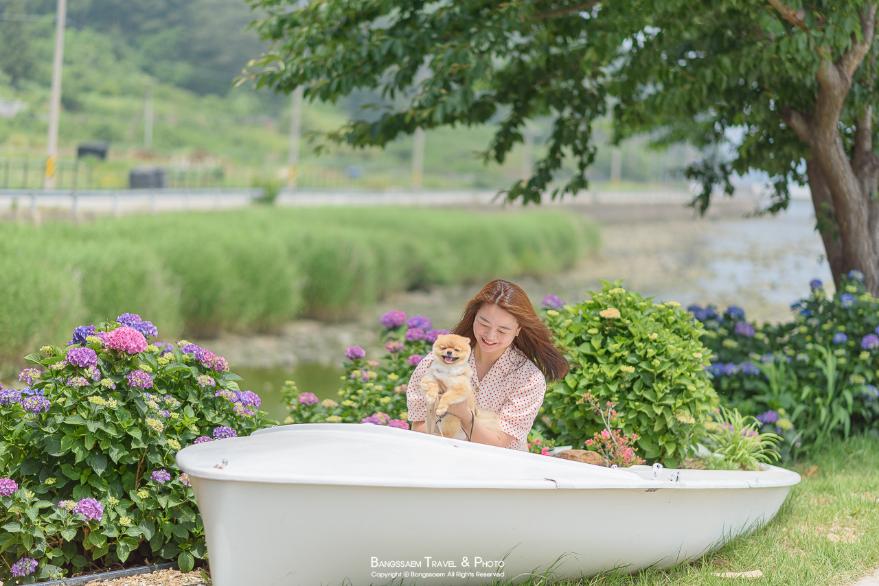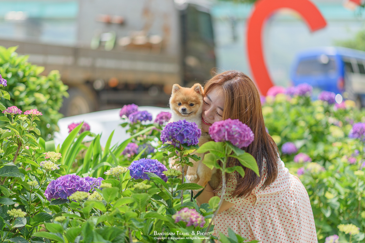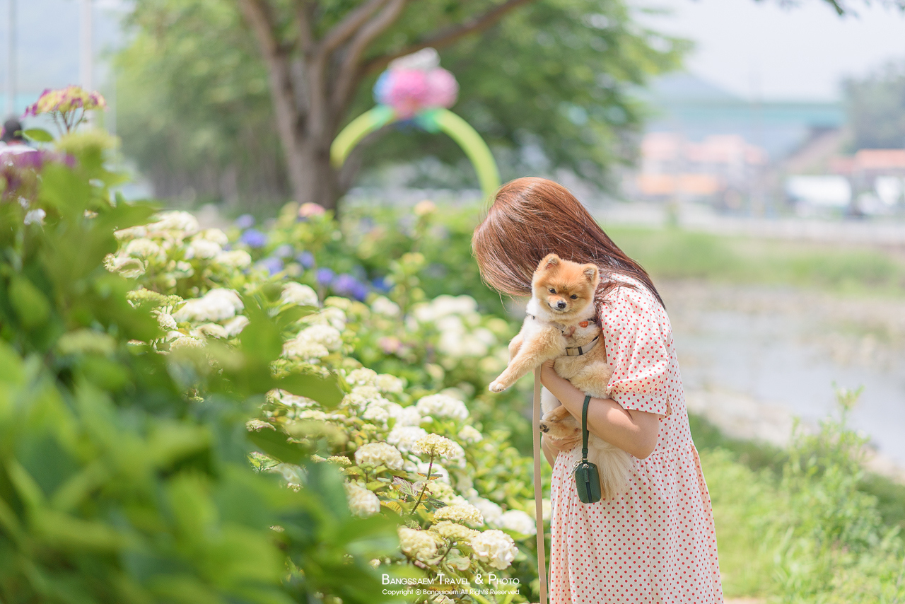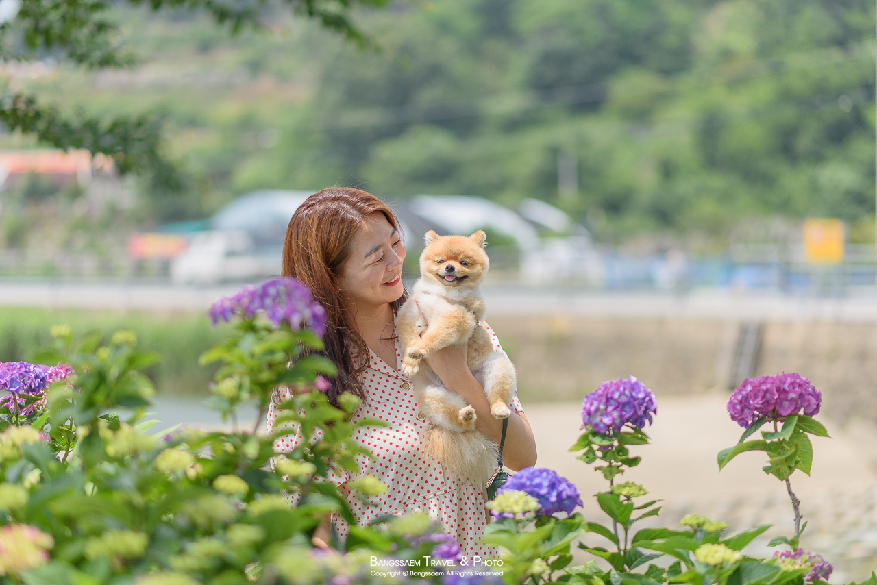 우리 방방이도 처음 걸어보는 여기 이 통영 광도천의 수국 길이 마음에 드는 모양이다.