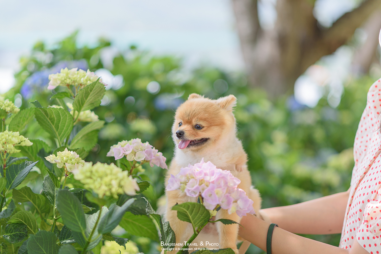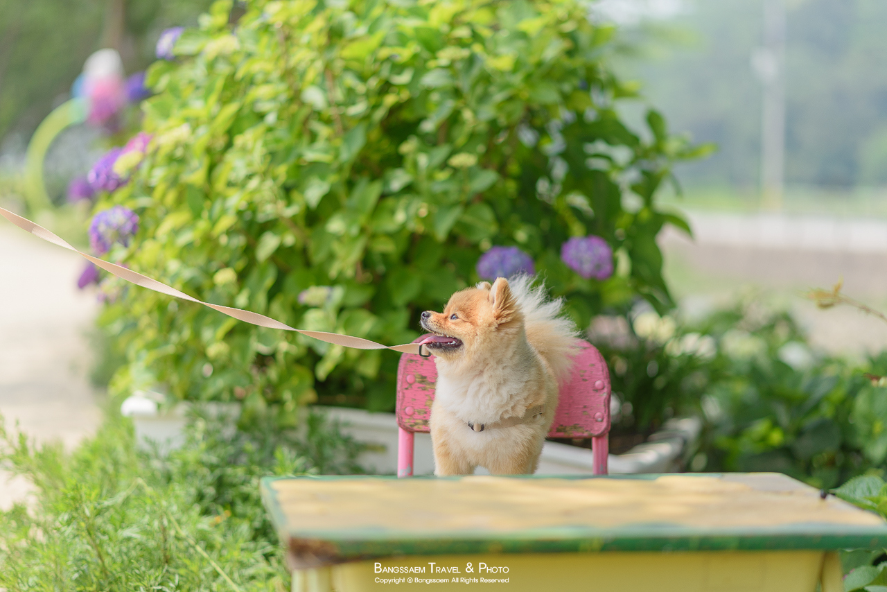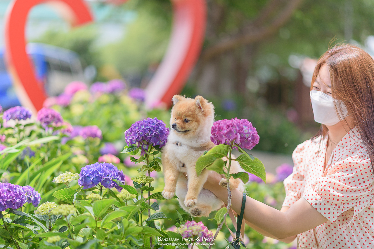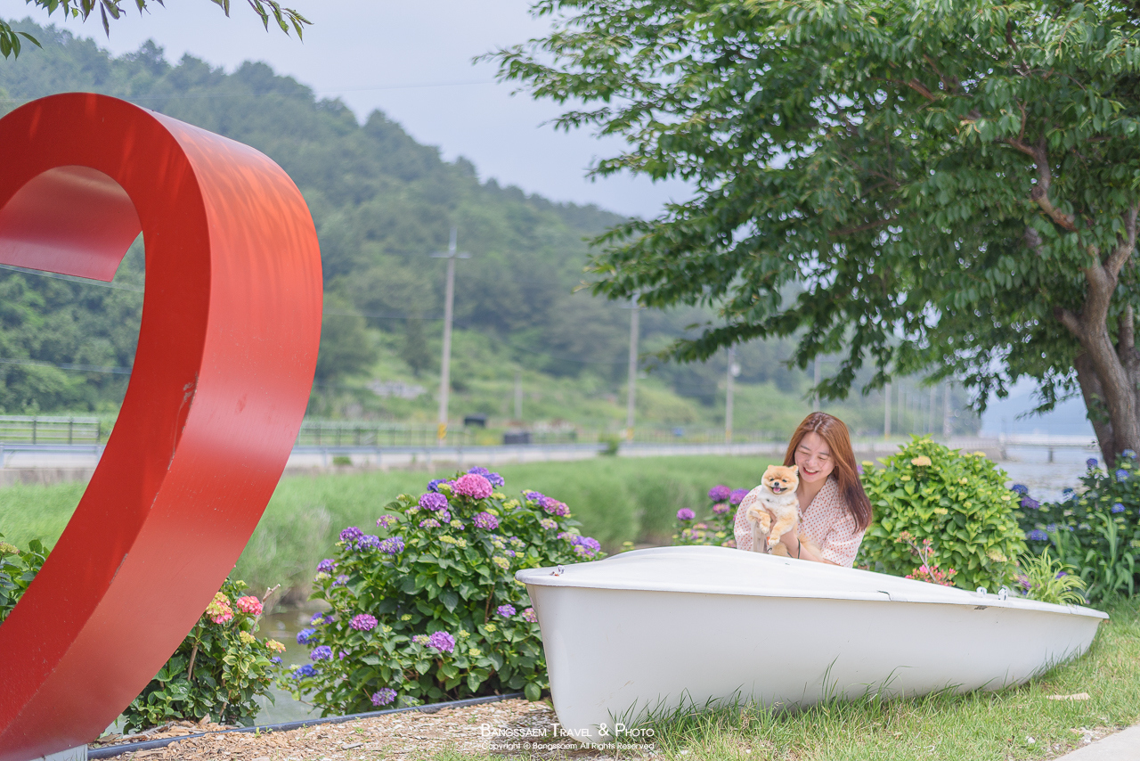 우리 방방이도 처음 걸어보는 여기 이 통영 광도천의 수국 길이 마음에 드는 모양이다.