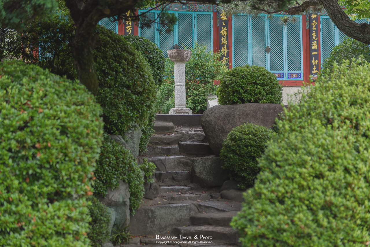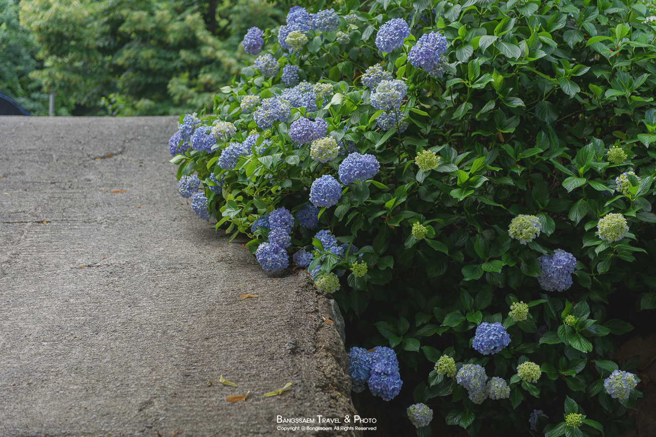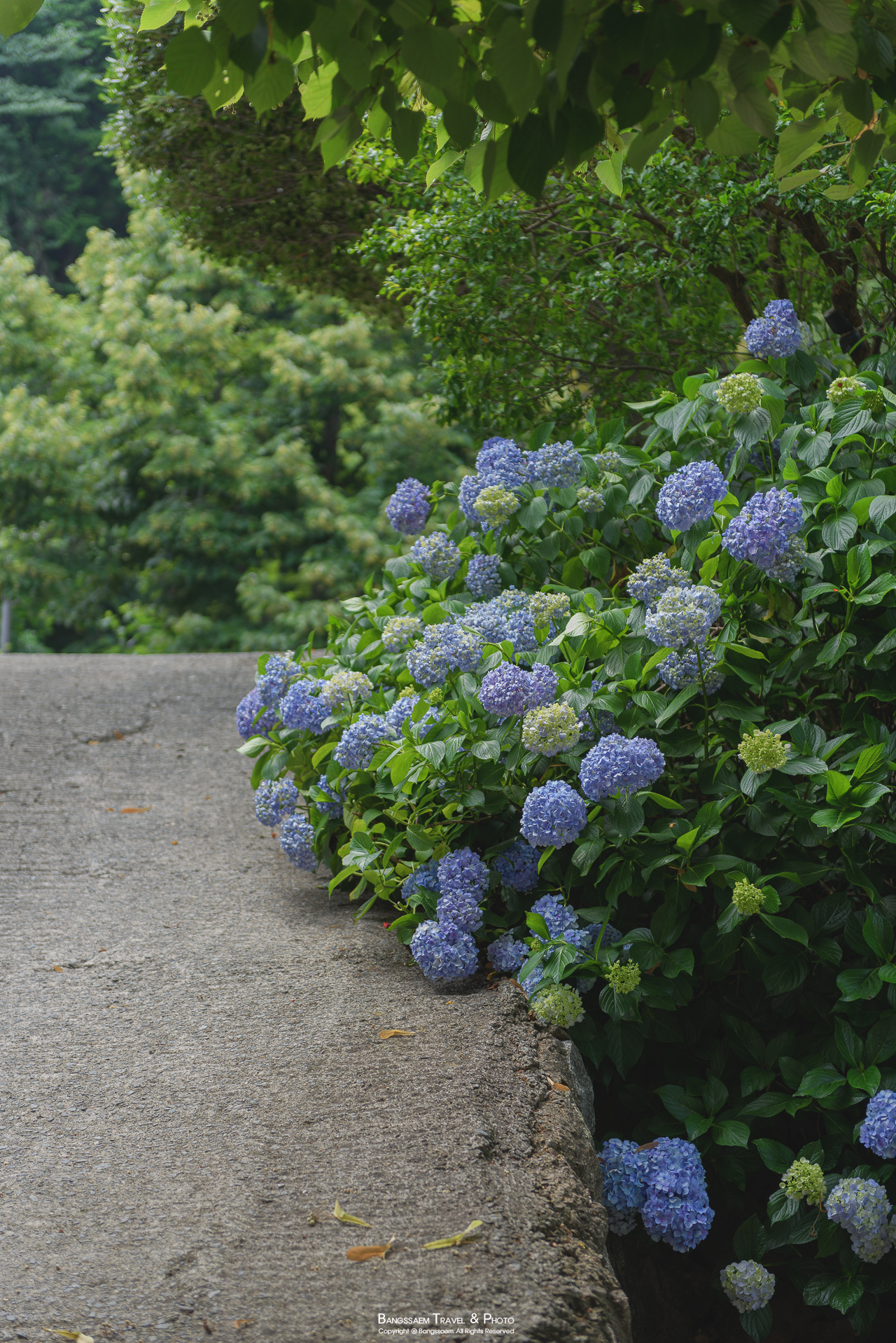 대웅전 앞에서 아래쪽으로 내려가는 길목에는 파란색 수국이 예쁘게 피어있다. 아직 다 피지 않은 건가? 아니면 냉해로 많은 수의 수국들이 꽃을 피우지 못한 건가? 그 모습이 작년과는 많이 다르다.