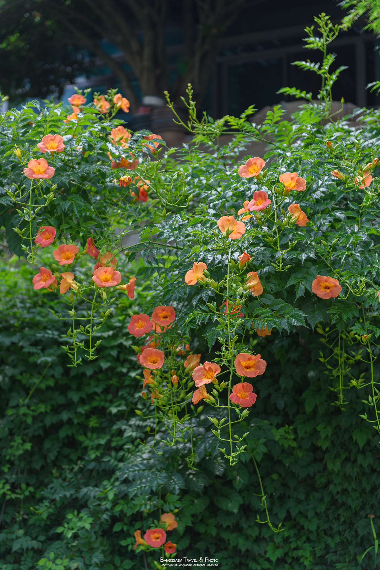 정확한 이름은 Chinese trumpet Creeper. 중국 나팔꽃이다. Creeper는 덩굴 식물이라는 의미니까 중국 나팔꽃 덩굴 식물, 뭐 그 정도의 이름이 되겠다.