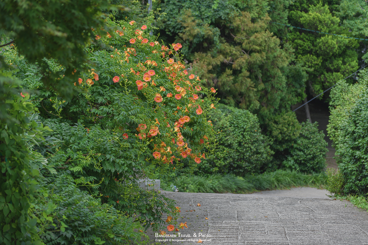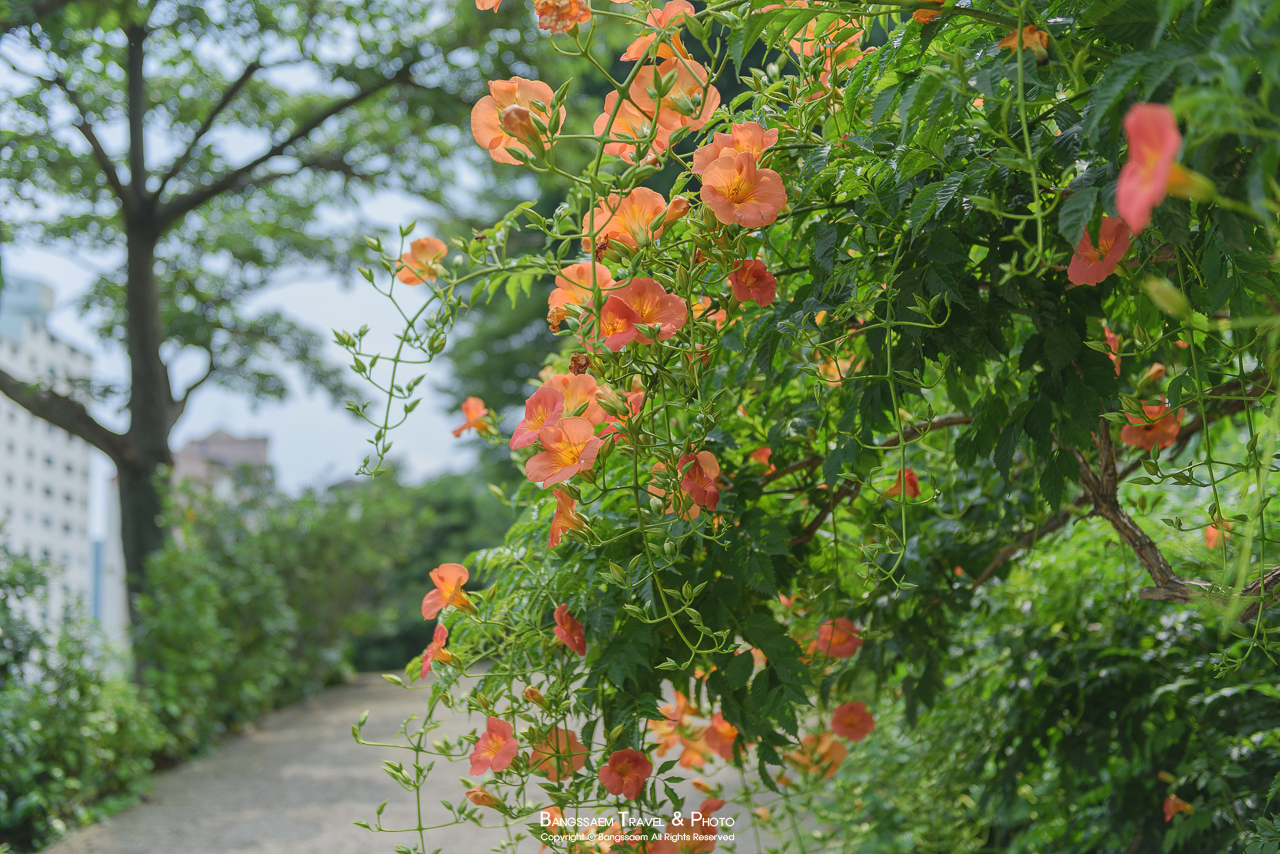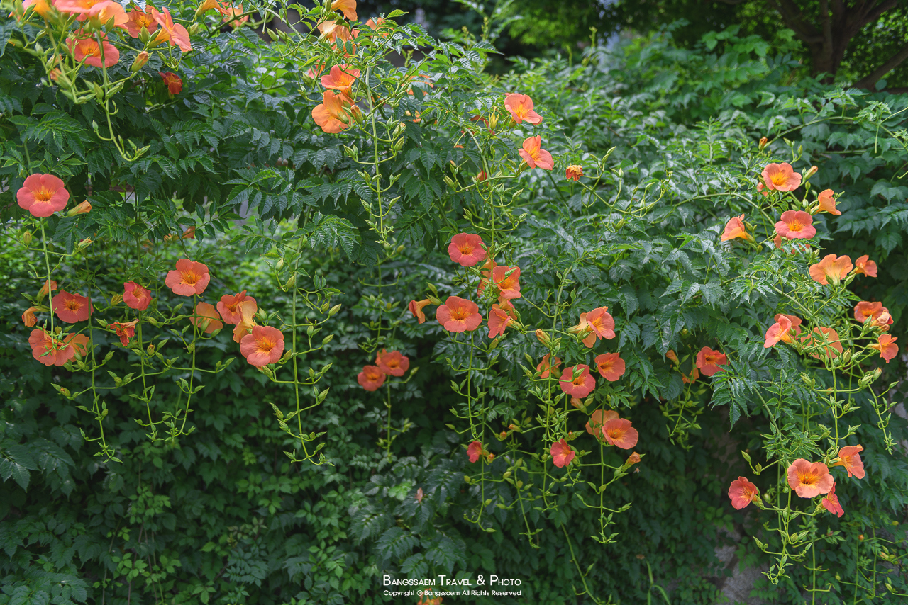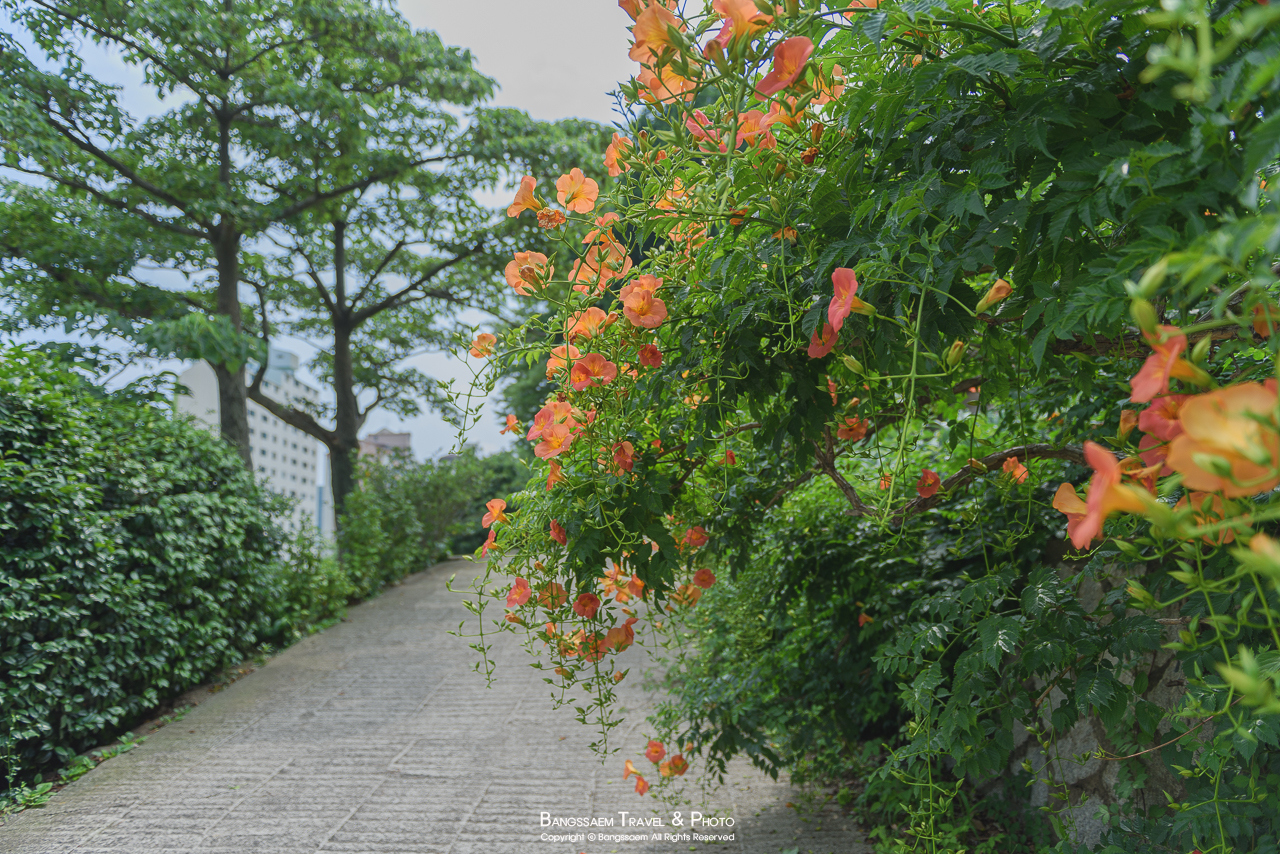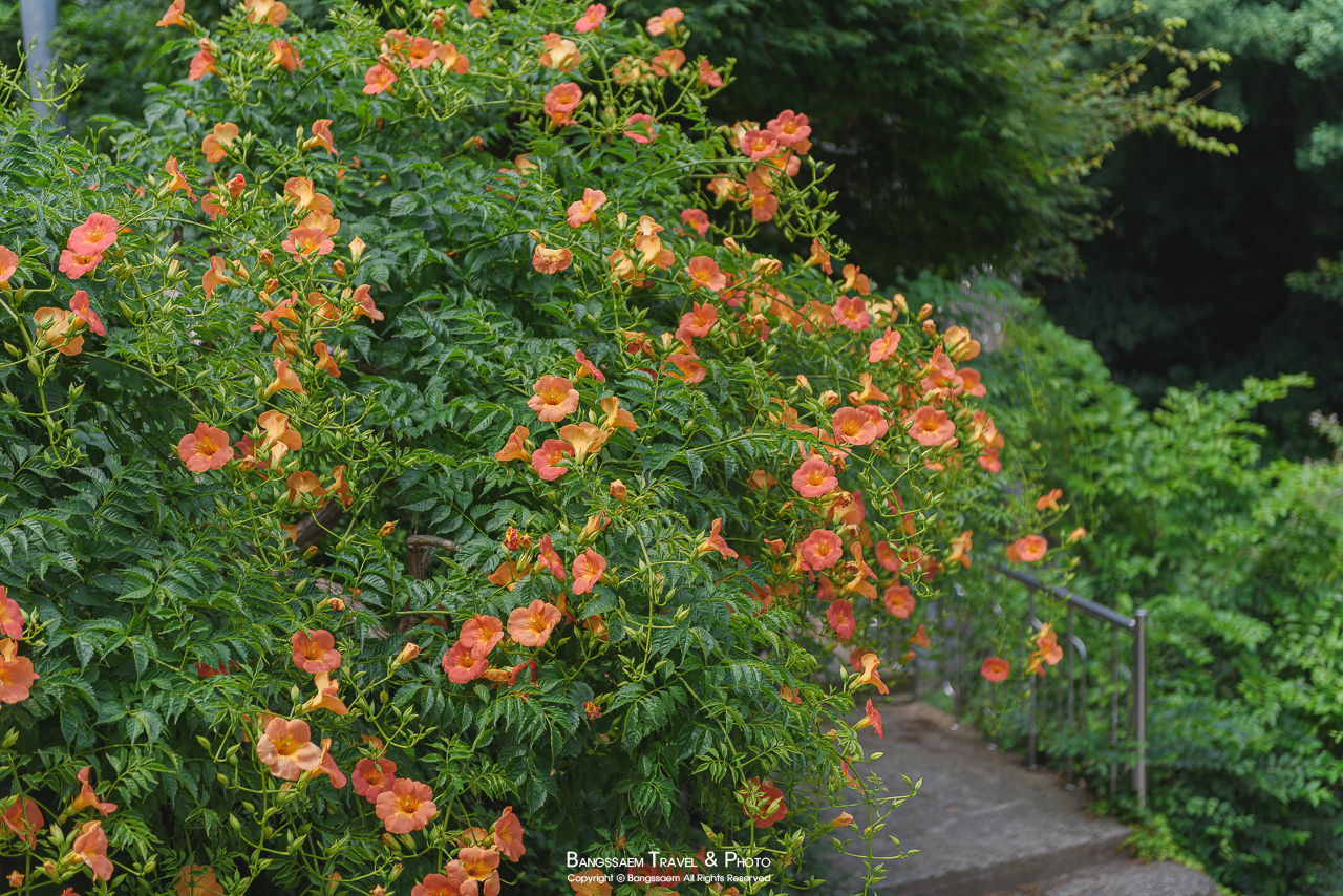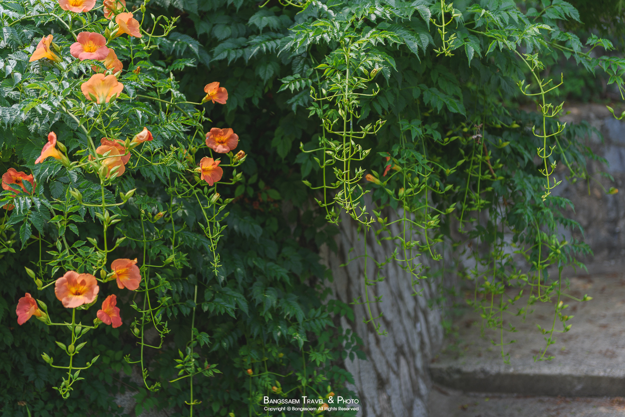 그 아래쪽에 이렇게 능소화가 예쁘게 피어있다. 내가 처음 도착했을 때는 사람이 한 명도 없었는데 내가 도착한 직후에 여기 능소화와 함께 사진을 찍으러 온 사람들이 도착했다. 시간도 넉넉하고 다른 약속도 없는 날이라 그 두 사람이 사진을 다 찍고 자리를 비우기까지 그냥 근처를 서성이며 기다렸다. 이런 여유로움도 오랜만에 가져보는 것 같아 그 느낌이 나쁘지는 않았다.