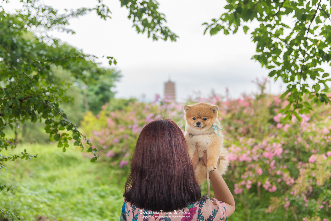 사실 나는 조금 늦은 시기에 찾아가서 배롱나무는 꽃이 지고 있는 시기였다. 아마도 지금은 배롱나무 꽃잎이 더 많이 떨어졌겠지? 그럼에도 불구하고 여전히 매력적인 모습을 보여주는 곳이었다. 이미 인터넷에 장소에 관한 정보는 많이 올라와 있기 때문에 찾는 것이 그렇게 어렵지는 않았다. 또 비가 조금씩 내리던 날이라(다행히 우리가 도착했을 때는 비가 그쳤지만) 사람도 거의 없었다. 그래서 여유롭게 황룡원 배경의 배롱나무 군락을 즐겨볼 수 있었다.