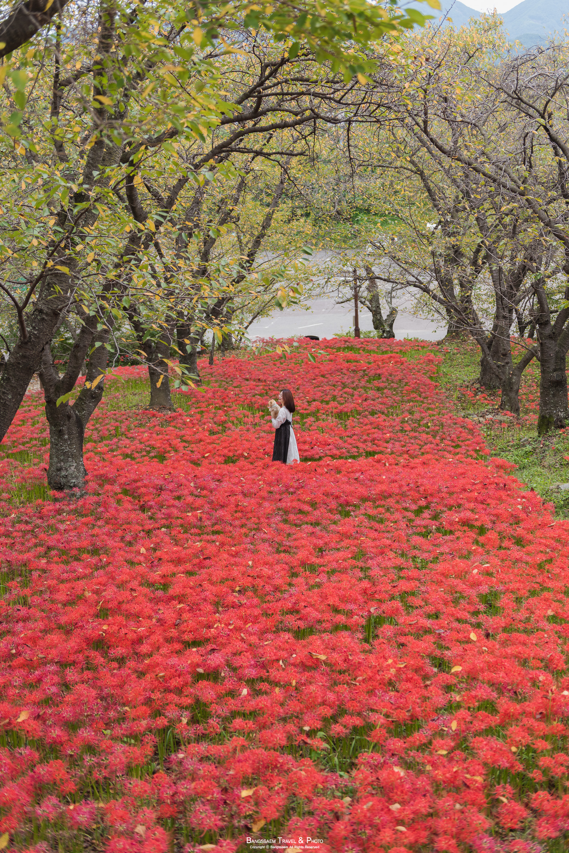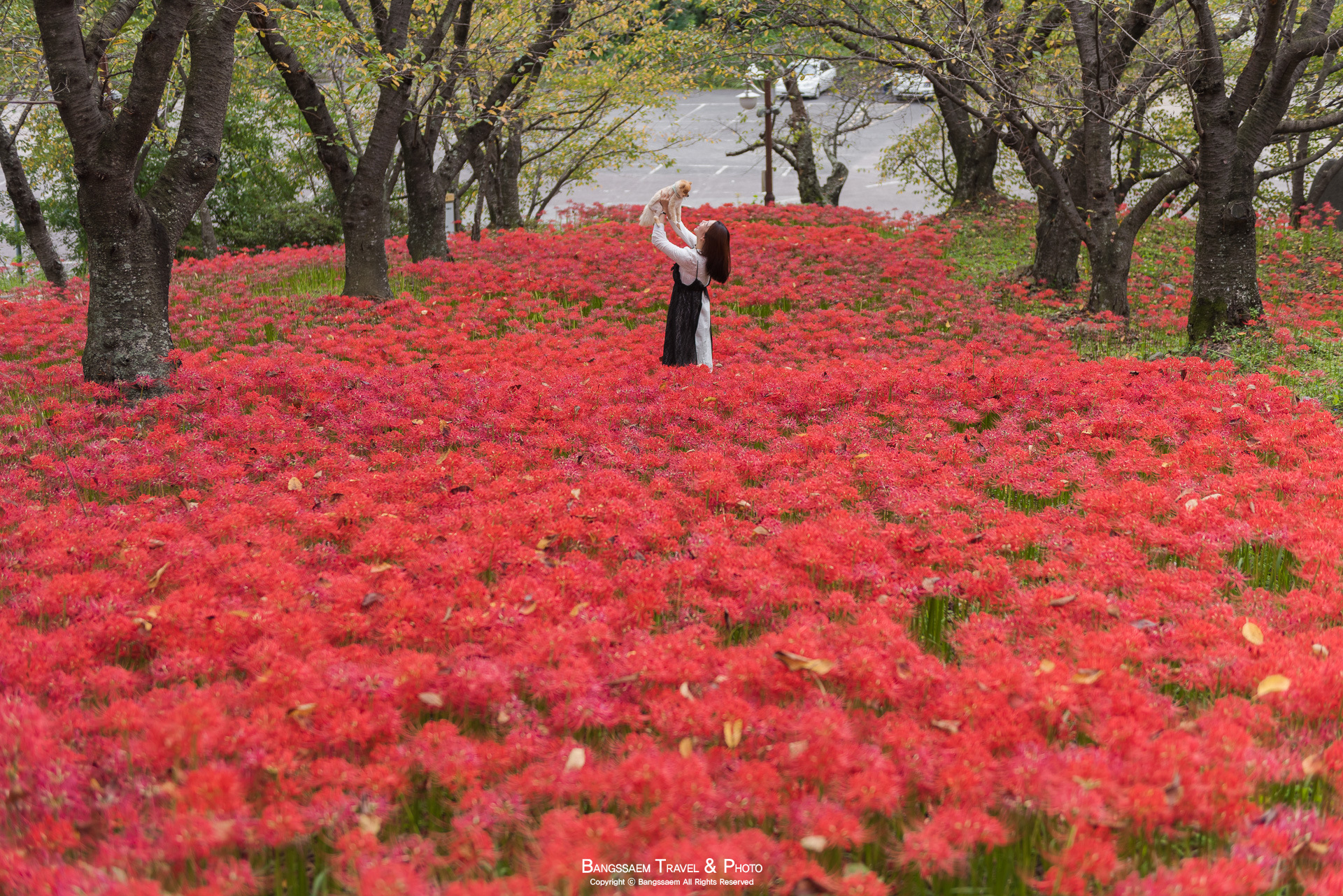 그리고 제일 좋은 점? 사람이 많지 않다는 것이다. 우리가 사천 선진공원에 꽃무릇을 만나기 위해 도착을 했을 때는 사람이 정말 단 한 명도 없었다. 우리가 사진을 찍고 있는 동안에 5-6명의 사람들이 더 찾아온 것이 전부였다. 그래서 너무 여유롭게 본의 아닌 언택트 여행을 즐길 수 있었다. 우리가 갔을 때는 꽃무릇이 조금씩 지기 시작하는 때였다. 그런데도 이렇게 아름다운 모습이라니! 내년에는 꼭 활짝 만개한 모습의 사천 선진공원 꽃무릇을 만나고 싶다.