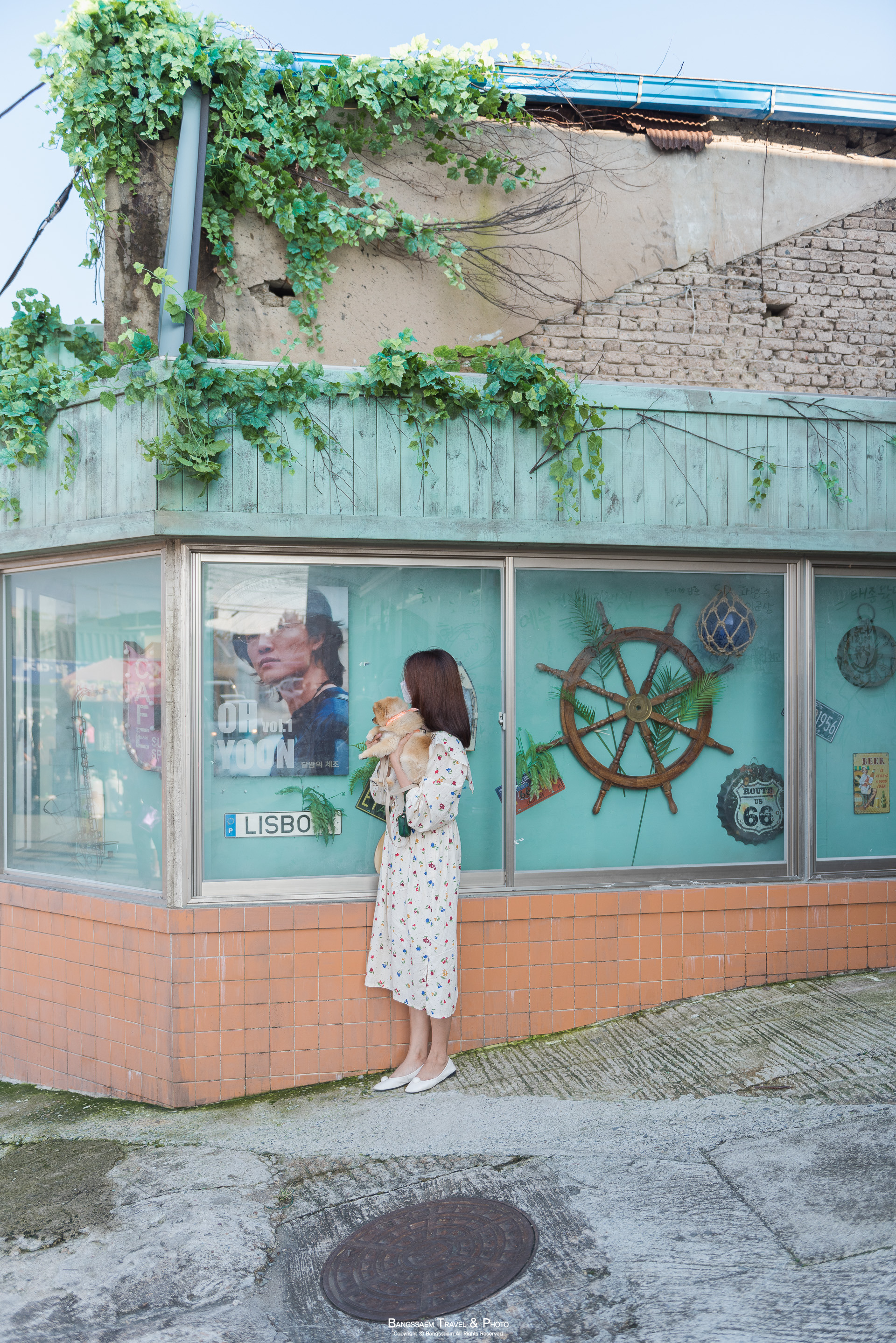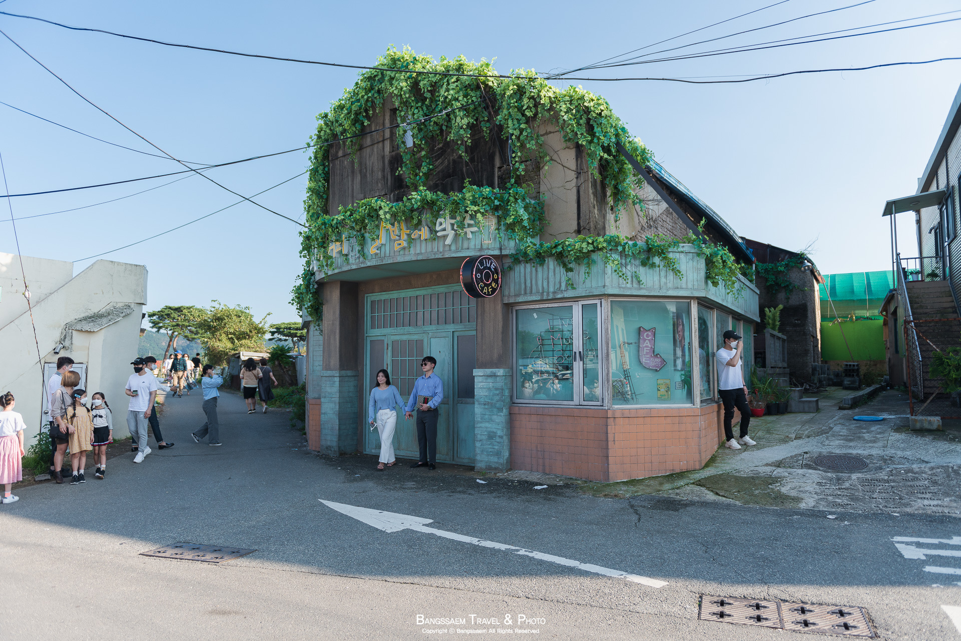 포항 청하시장에서 드라마 갯마을차차차 등장 인물들의 사랑방 역할을 하고 있는 '한낮에 커피, 달밤에 맥주' 가게 앞. 여기는 사람들이 너무 많아서 한참이나 줄을 서서 기다려야 그 앞에서 인증 사진을 한 장 남길 수 있다. 앞에는 사람에 너무 많아서 일단 그 옆에서 사진을 먼저 찍어본다. 우리 방방이도 갯마을차차차 정주행 중인데 드라마에서 본 1집 가수 오윤이 기억이 날까?
