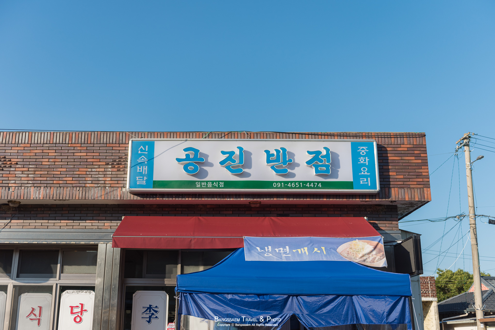 낮에는 볕이 너무 뜨거운 날이라 나는 줄을 서있고, 방방이와 옆지기는 그늘로 잠시 피신을 간 상황. 그늘에 내려주니 금세 표정이 밝아진 우리 방방이. 왼쪽에 보이는 건물이 공진반점인데 실제로는 다른 식당으로 운영이 되는 곳이었다.