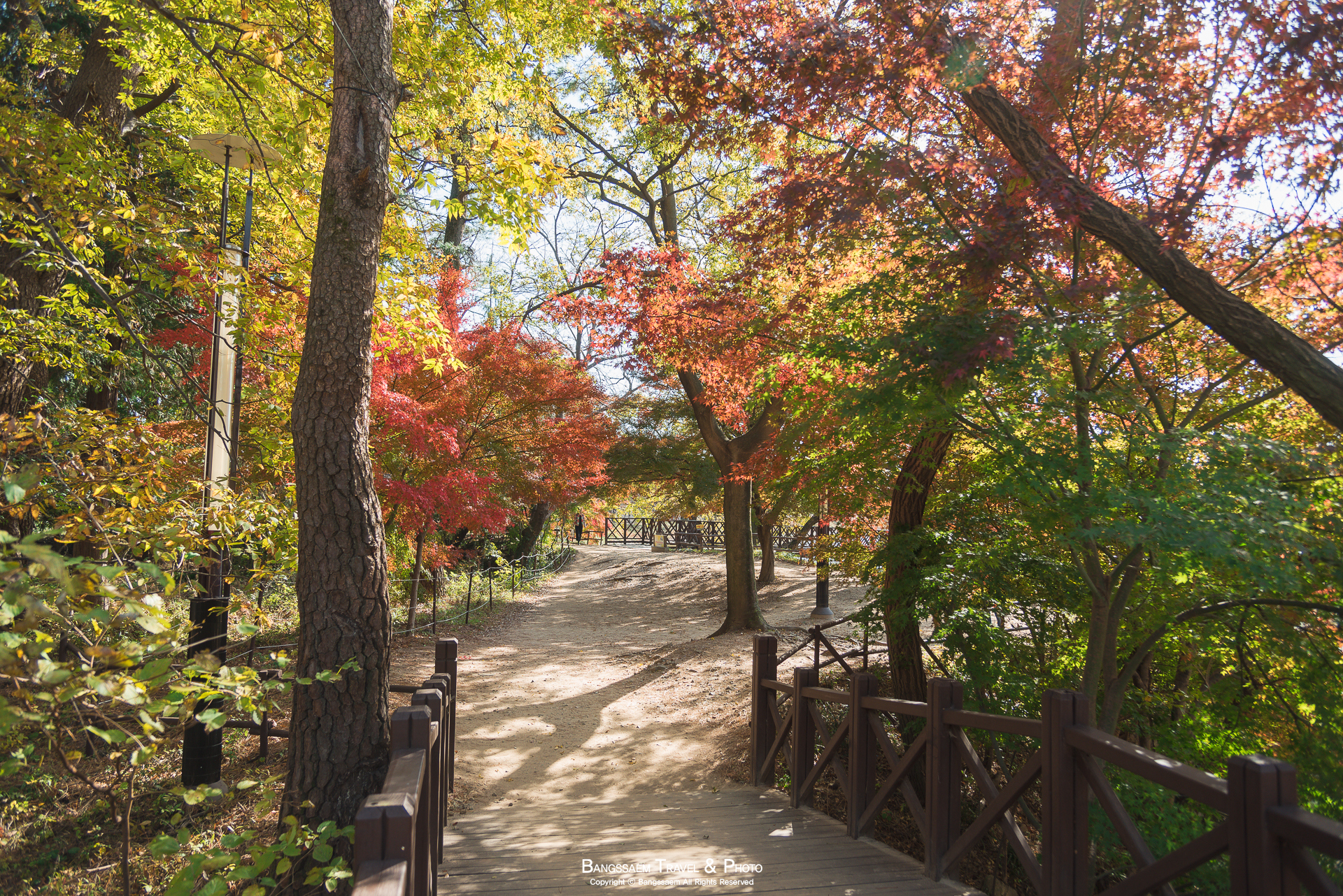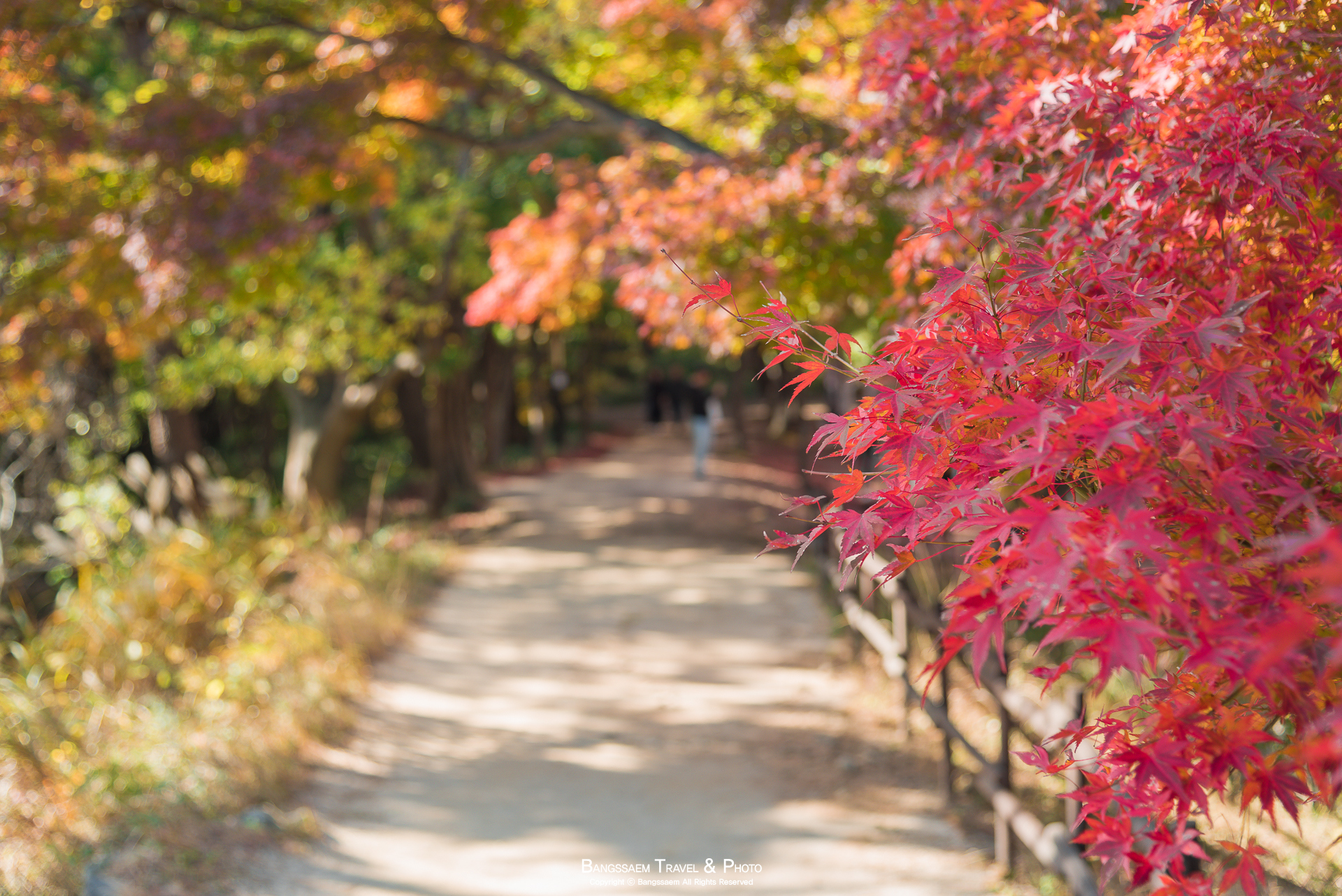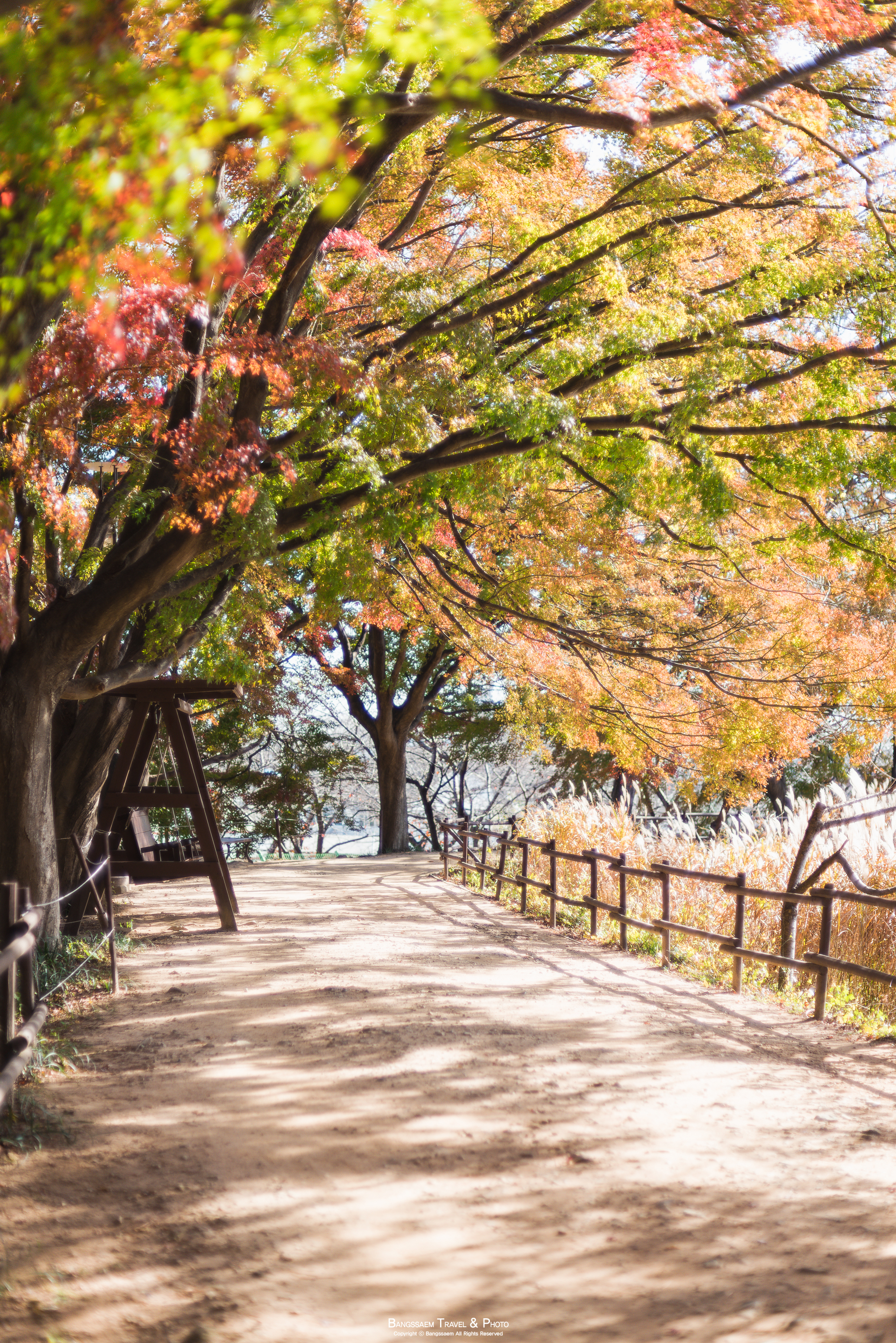 볕도 잘 들어오는 자리이고 나무들이 마치 지붕 인양 가지를 위에서 옆으로 축 늘어뜨리고 있어서 정말 단풍 터널을 걷는 것 같은 곳이다. 빛이 좋은 날에는 정말 화려한 색의 가을 단풍들을 만날 수 있다.