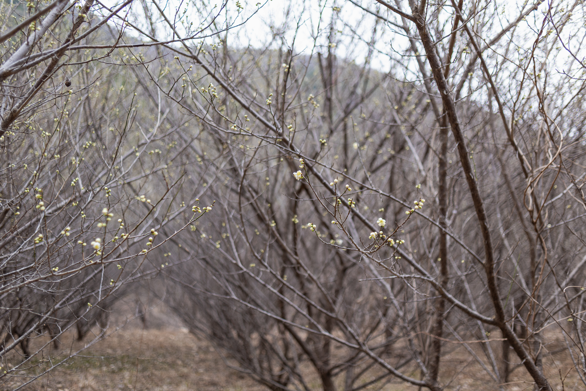 매화 군락에 도착. 저기 보이는 잡목 사이 계단을 올라가면 변산 바람꽃을 만날 수 있다.