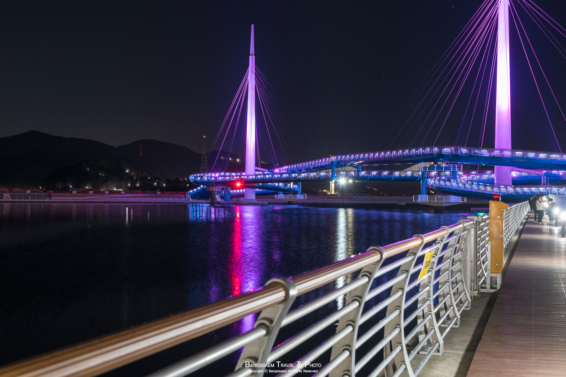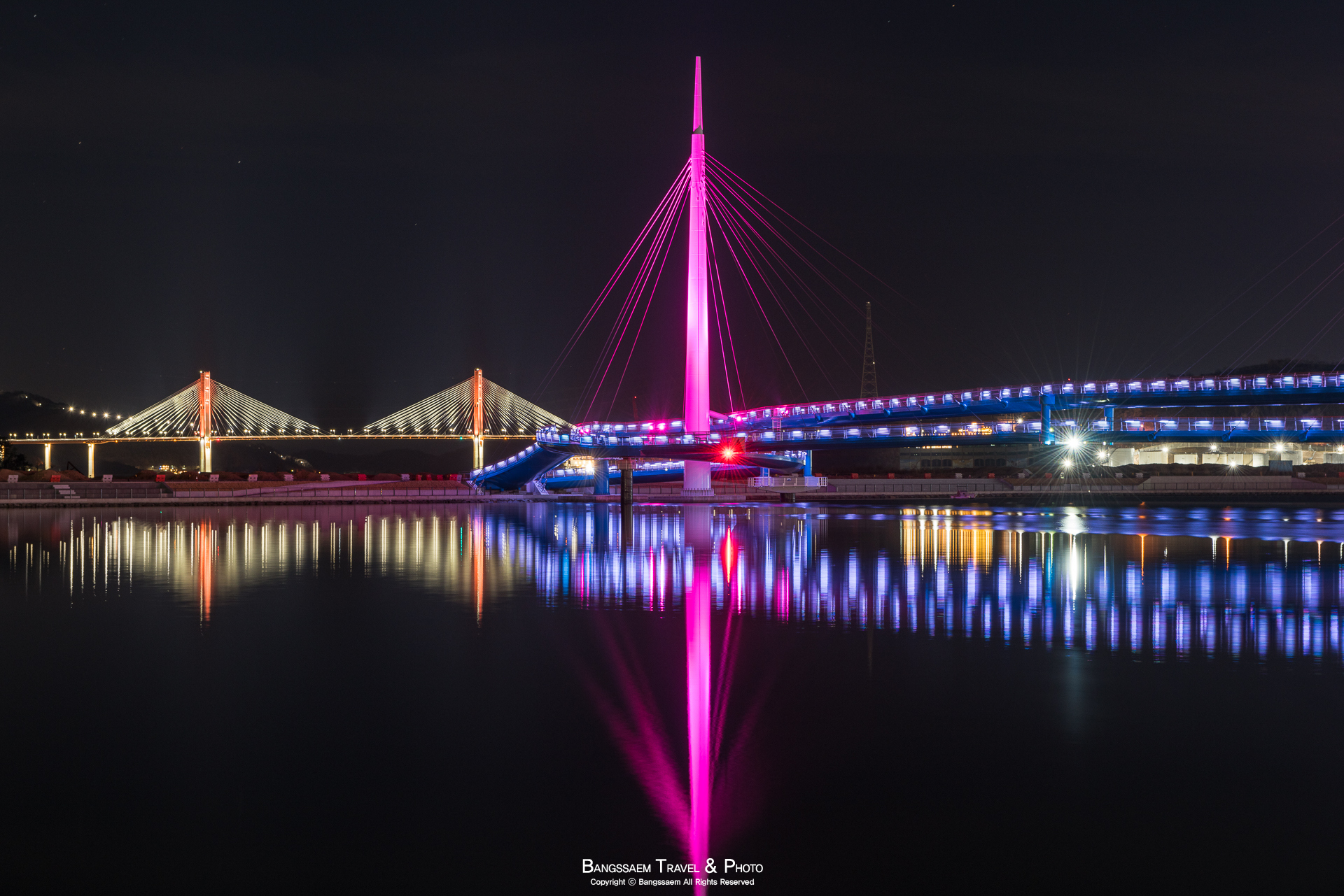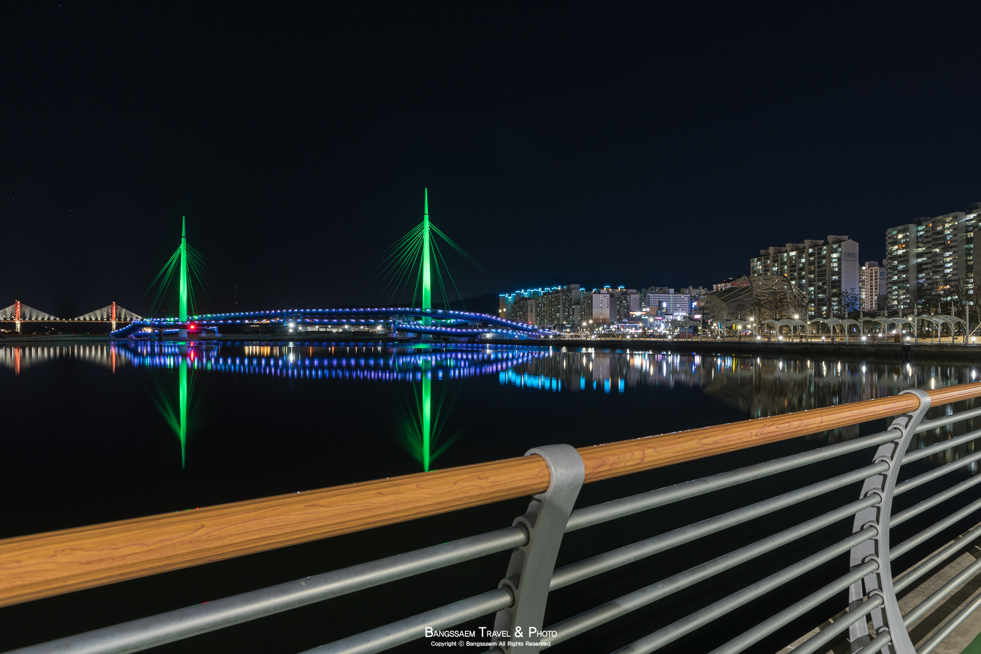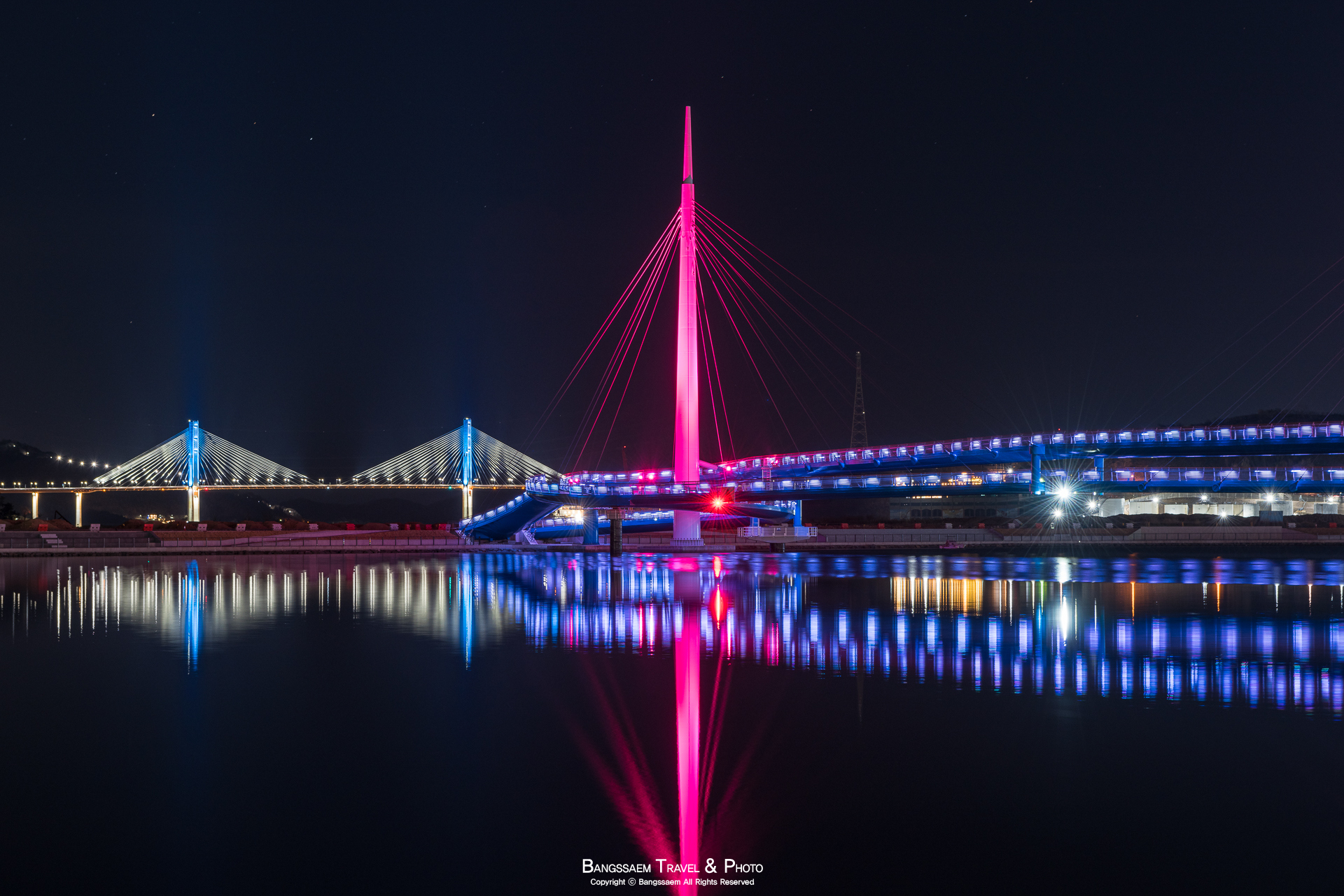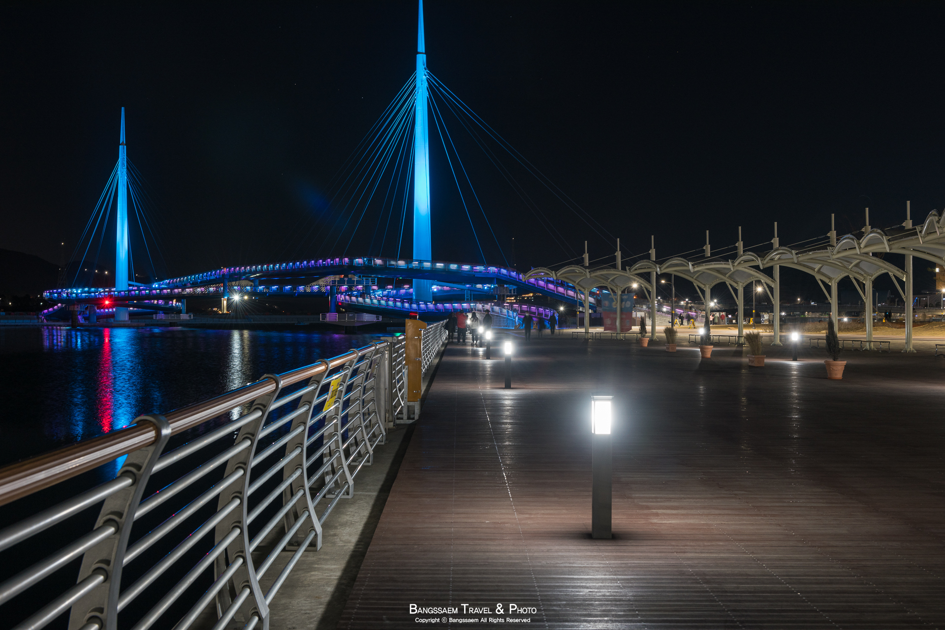 다리 기둥 조명의 색은 계속 바뀐다. 그래서 구경하는 눈도 덜 지루해지는 것 같다.