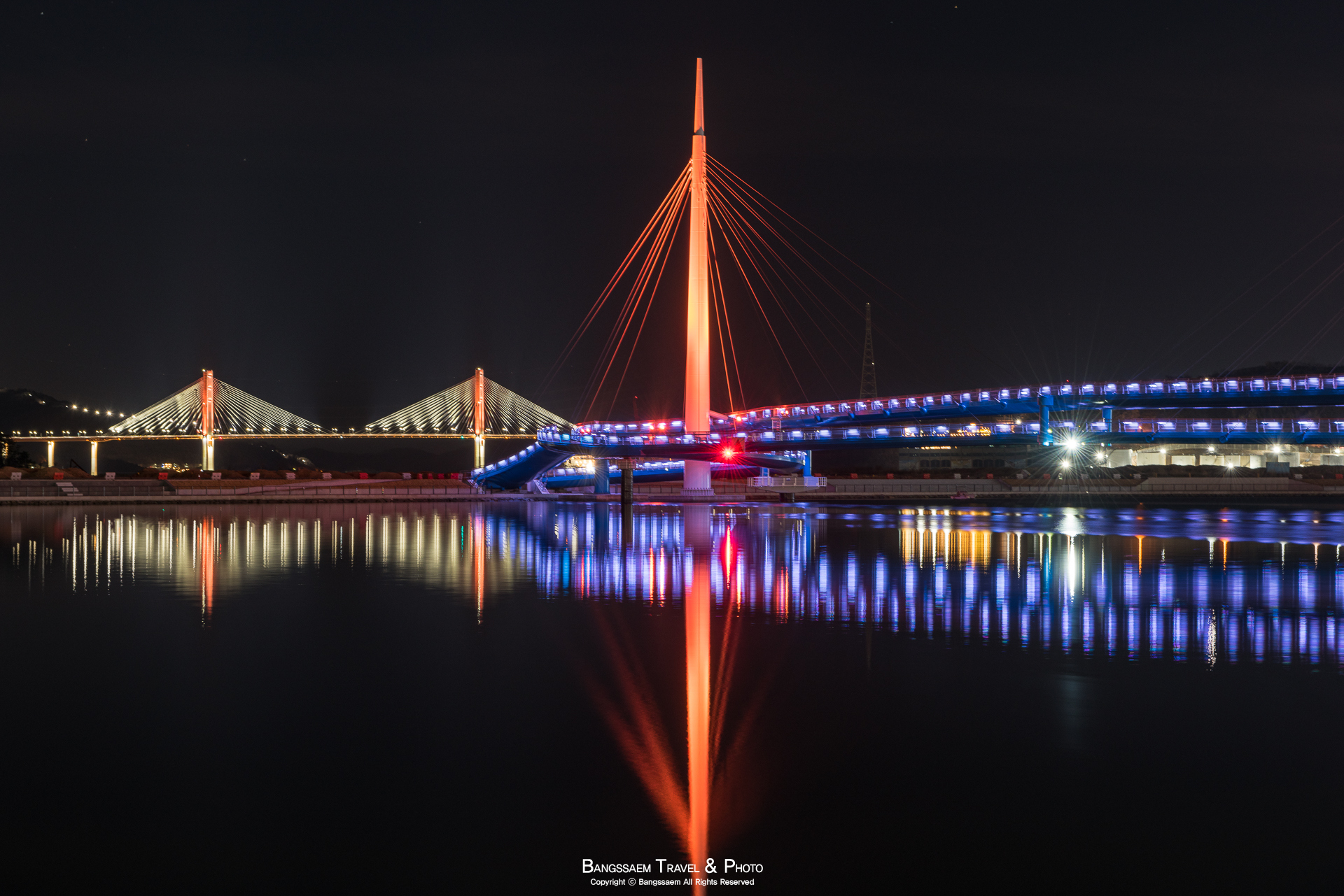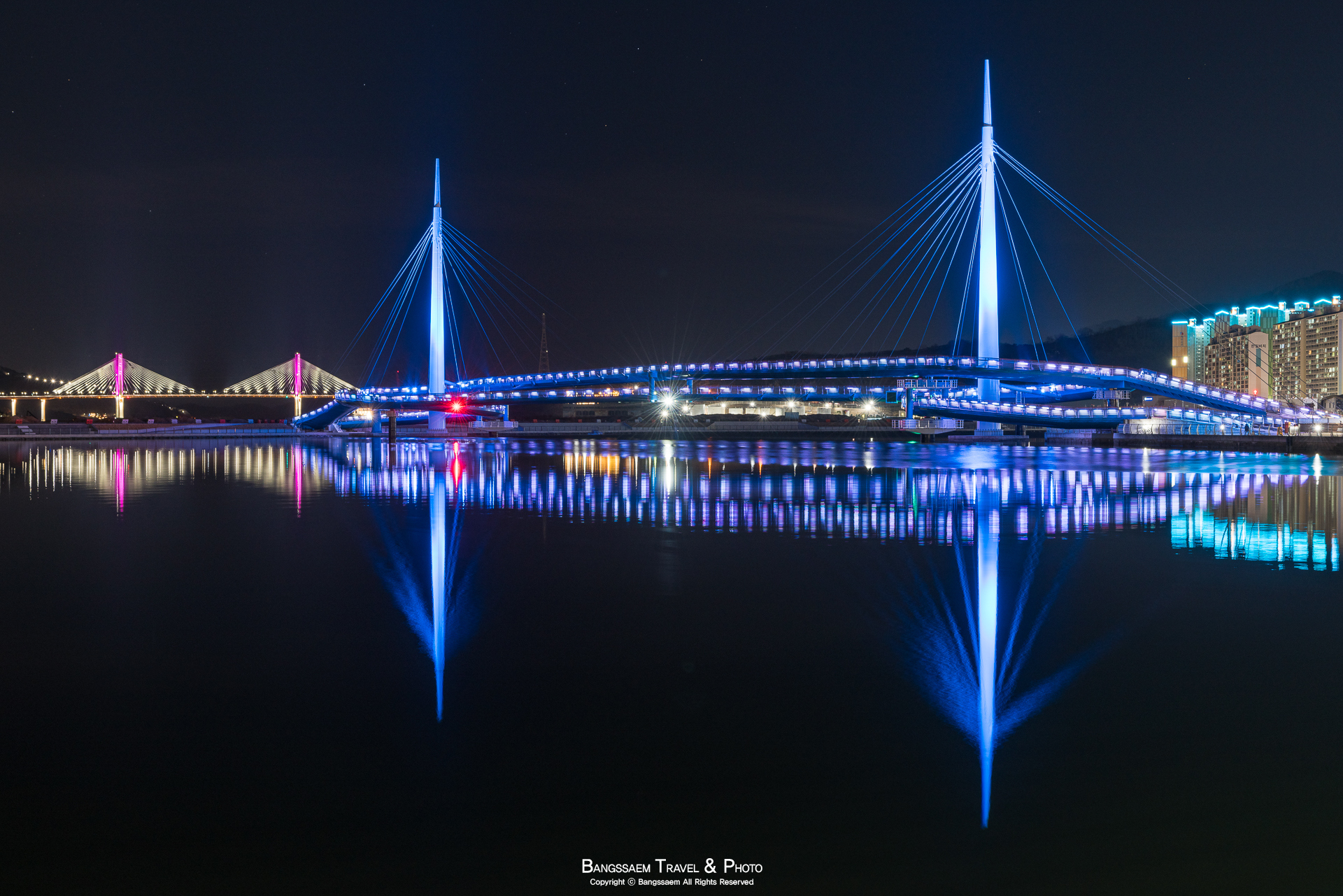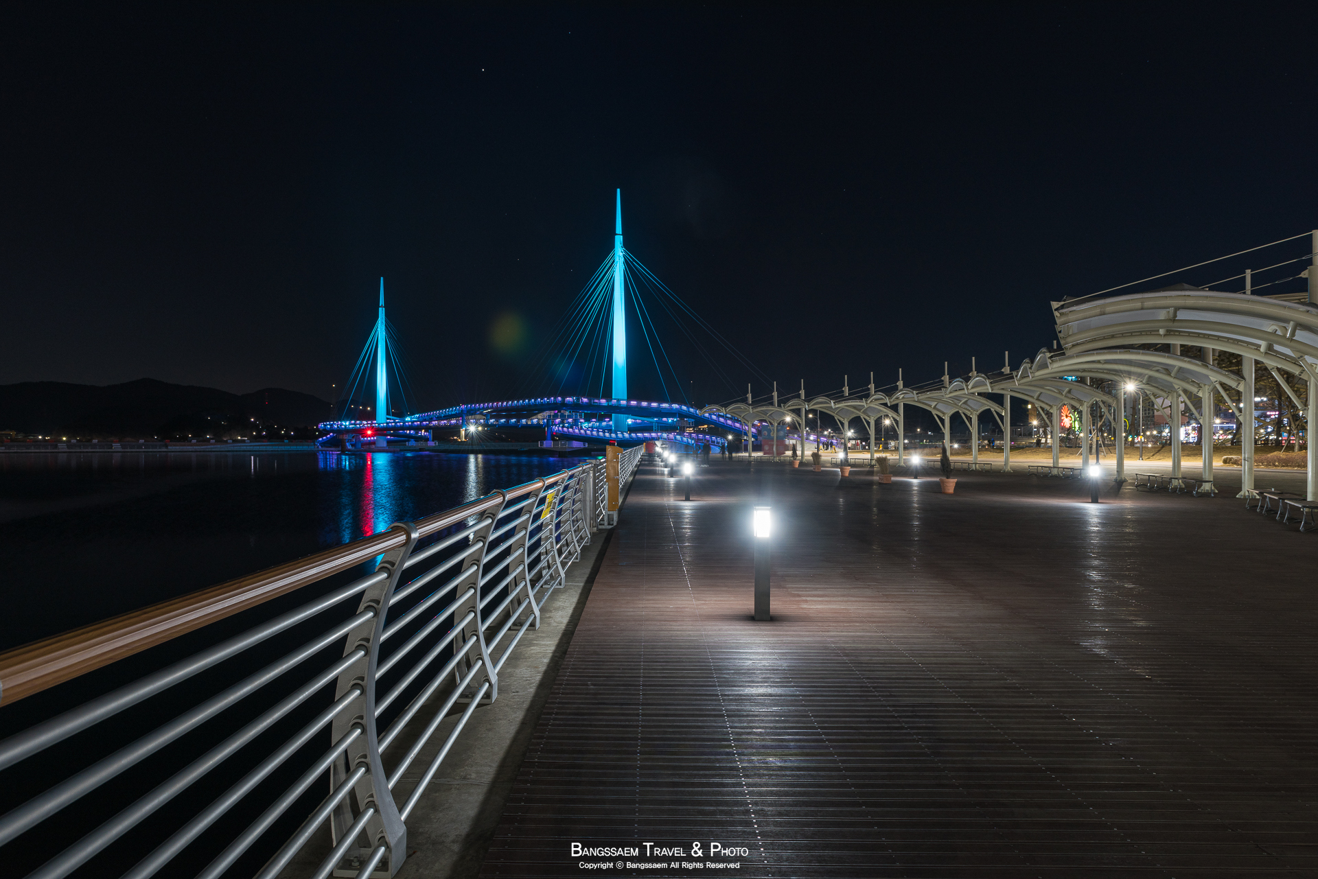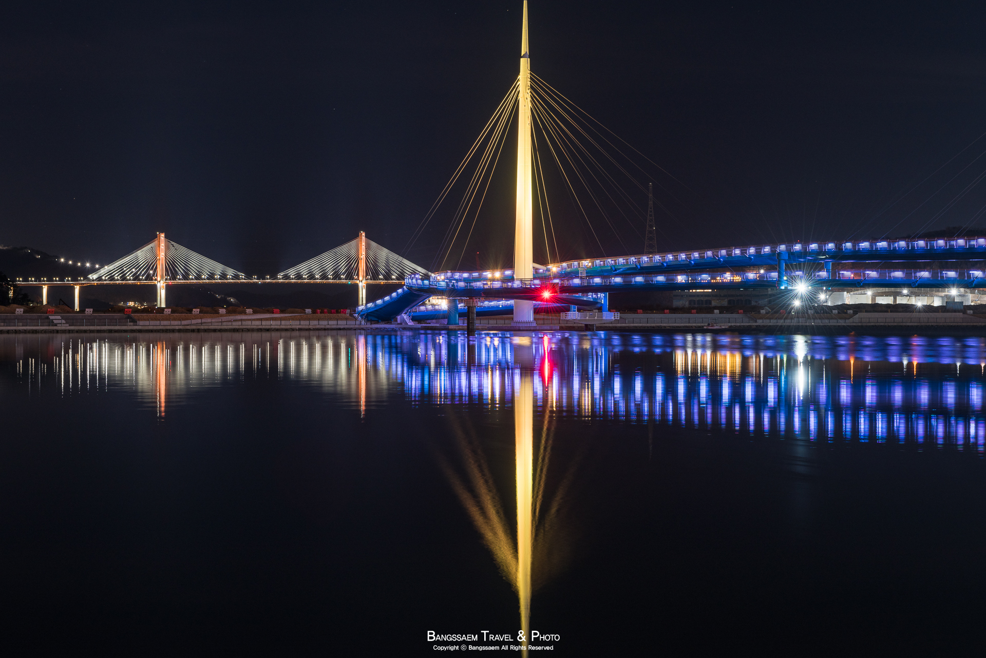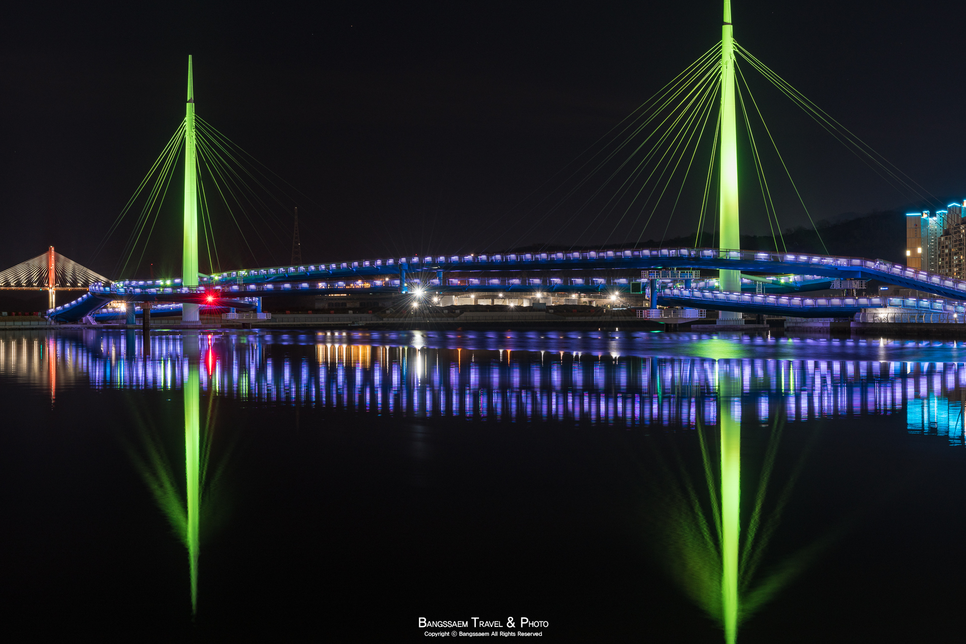 다리 기둥 조명의 색은 계속 바뀐다. 그래서 구경하는 눈도 덜 지루해지는 것 같다.
