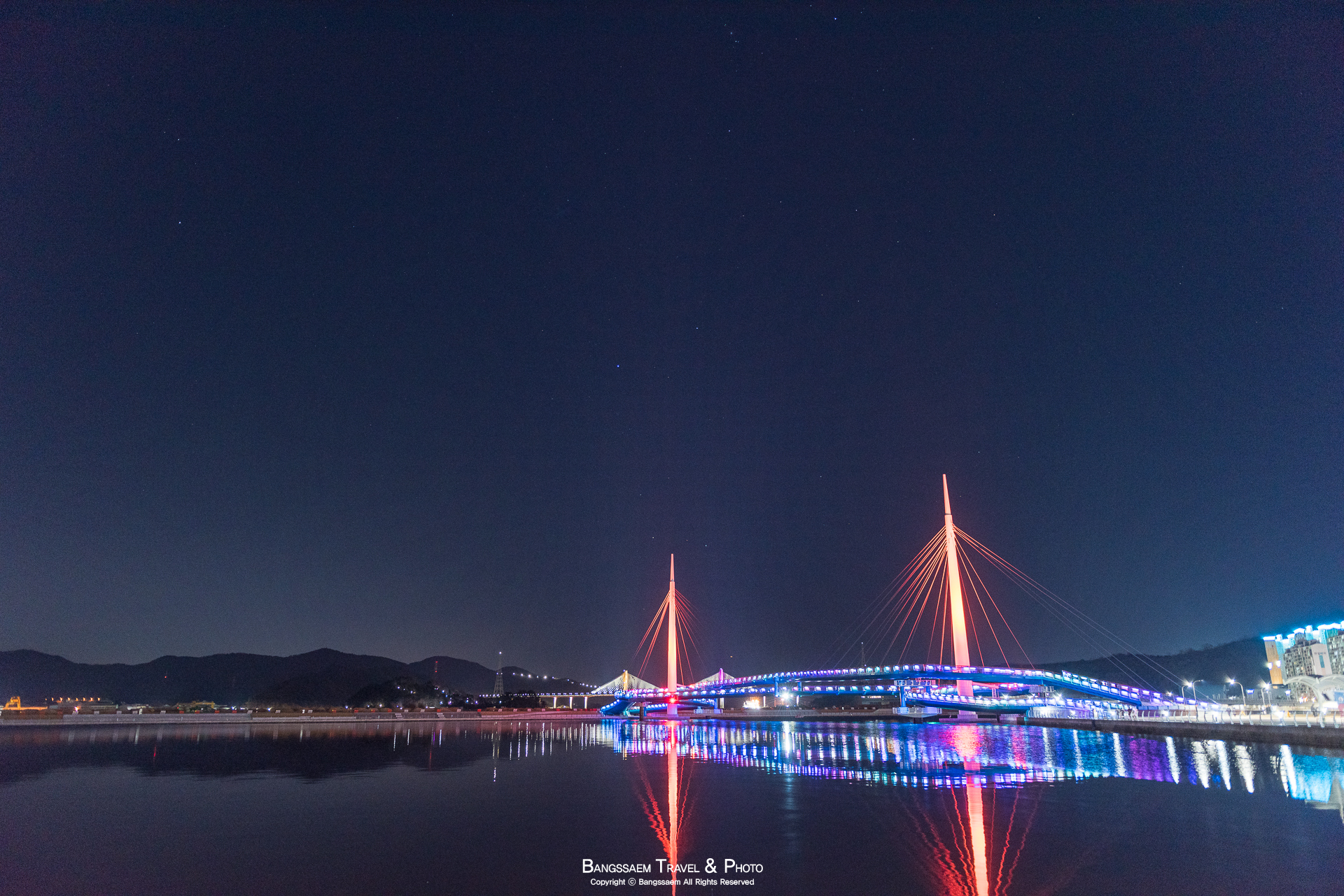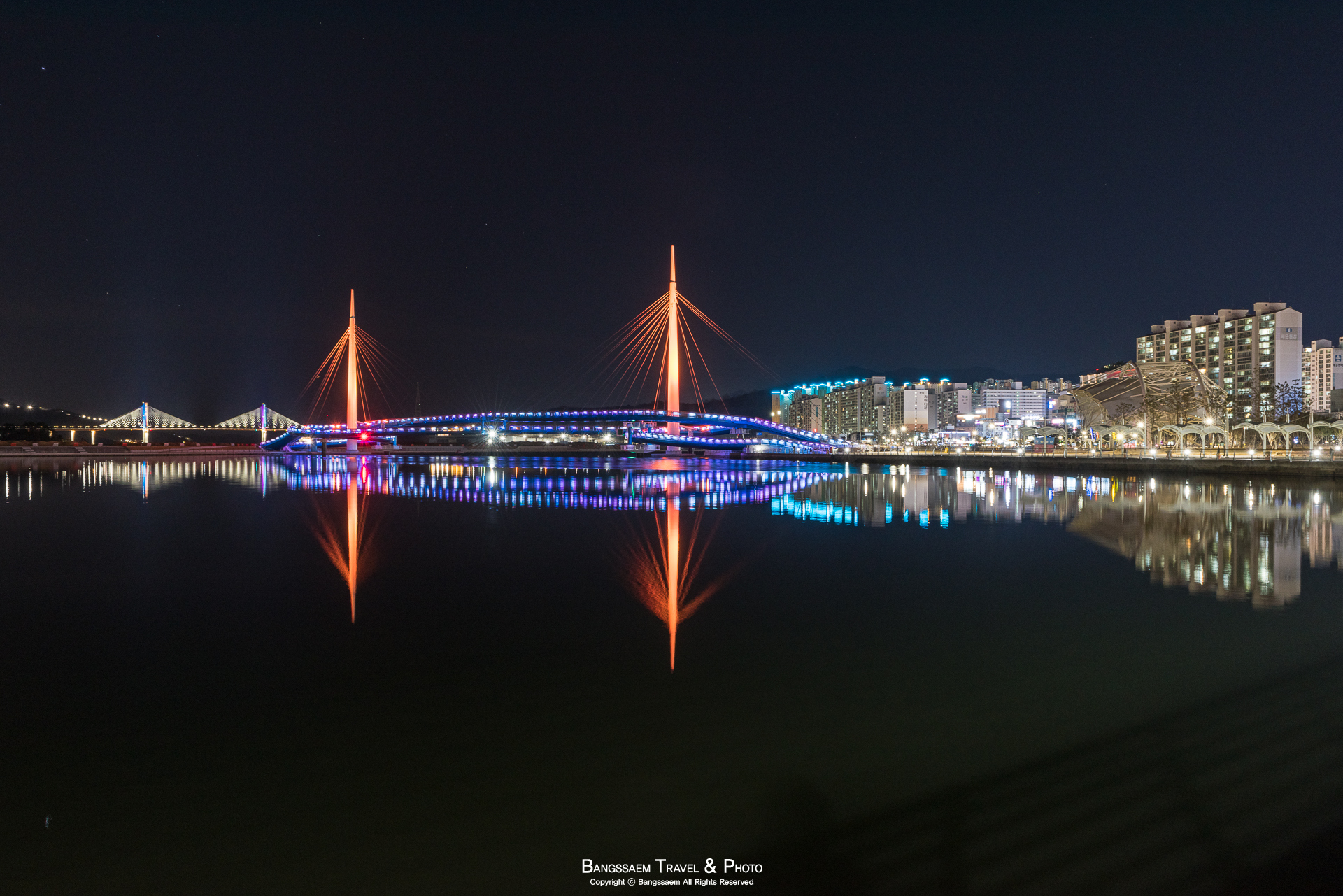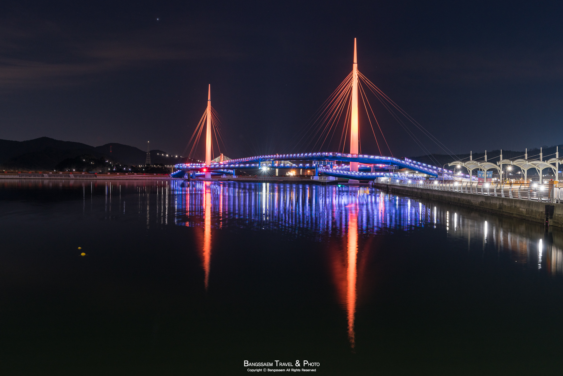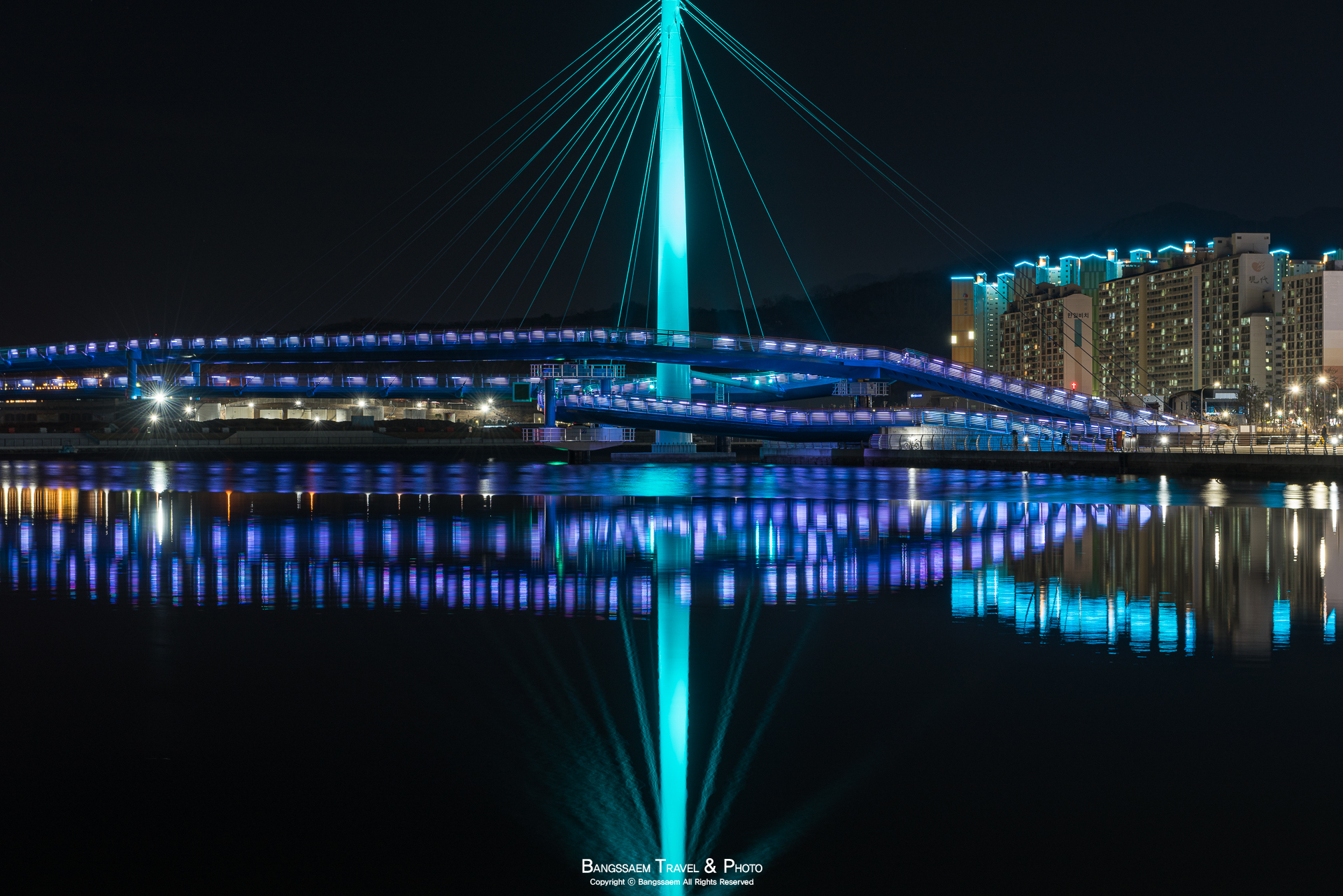 다리 기둥 조명의 색은 계속 바뀐다. 그래서 구경하는 눈도 덜 지루해지는 것 같다.