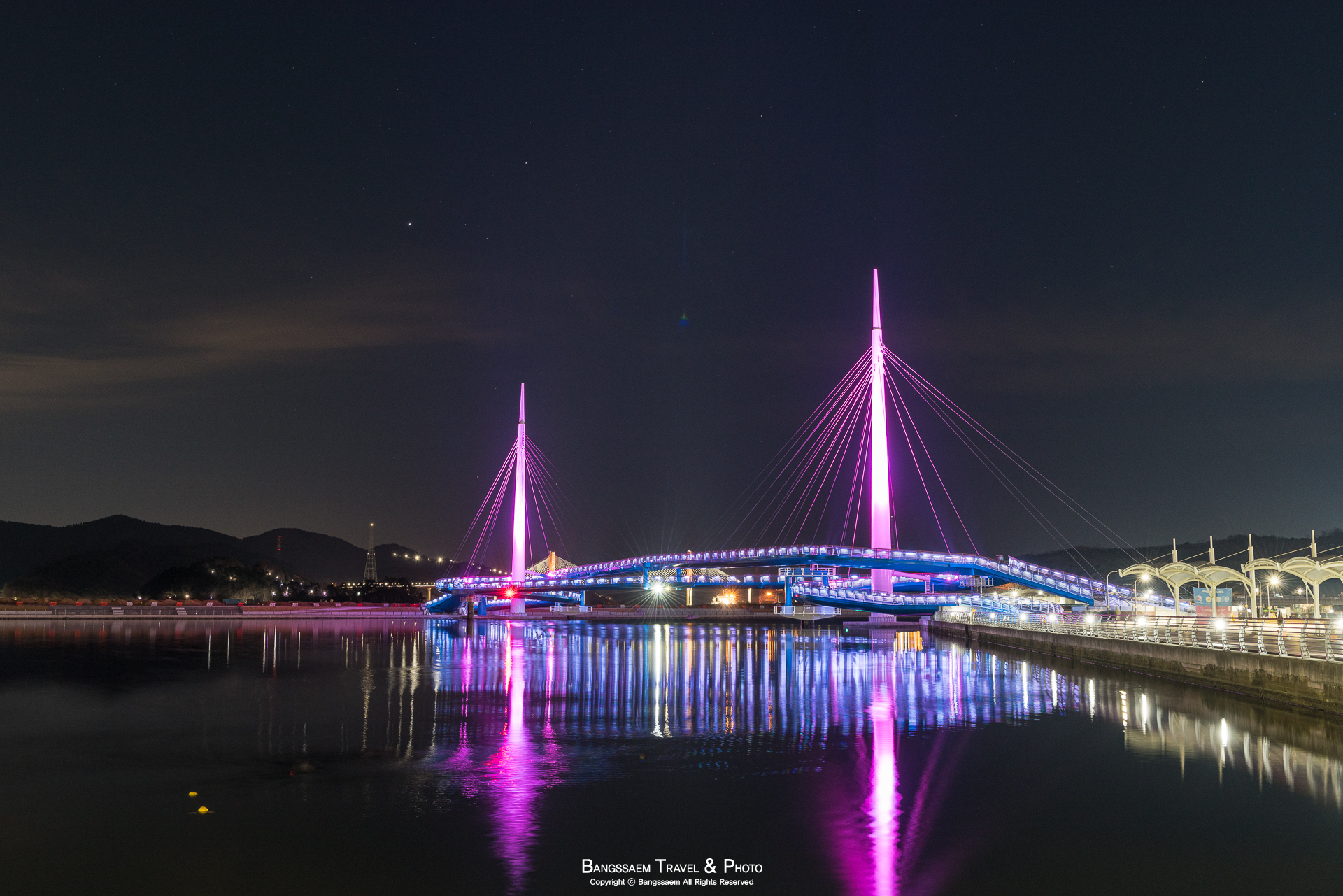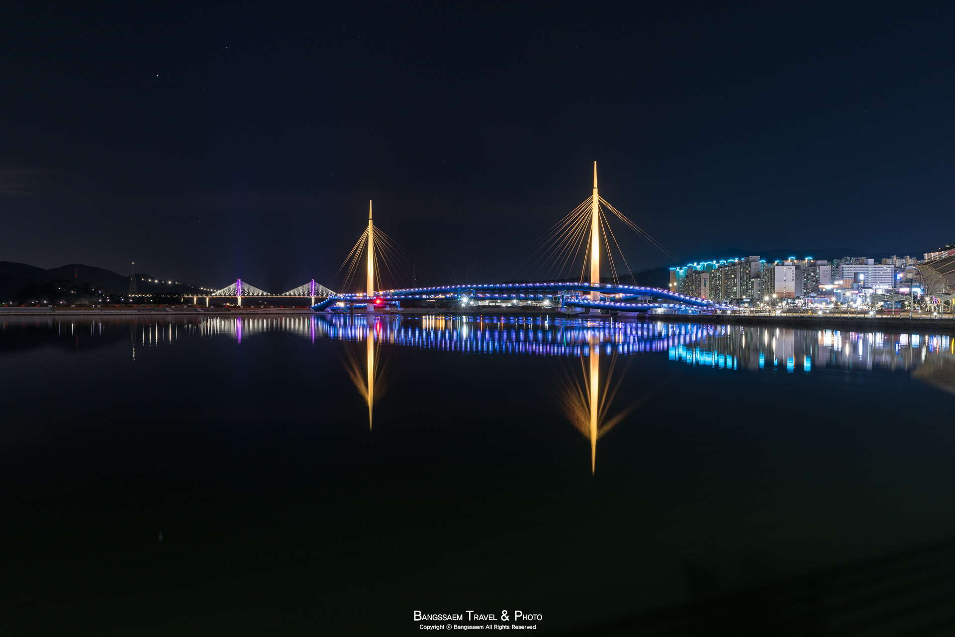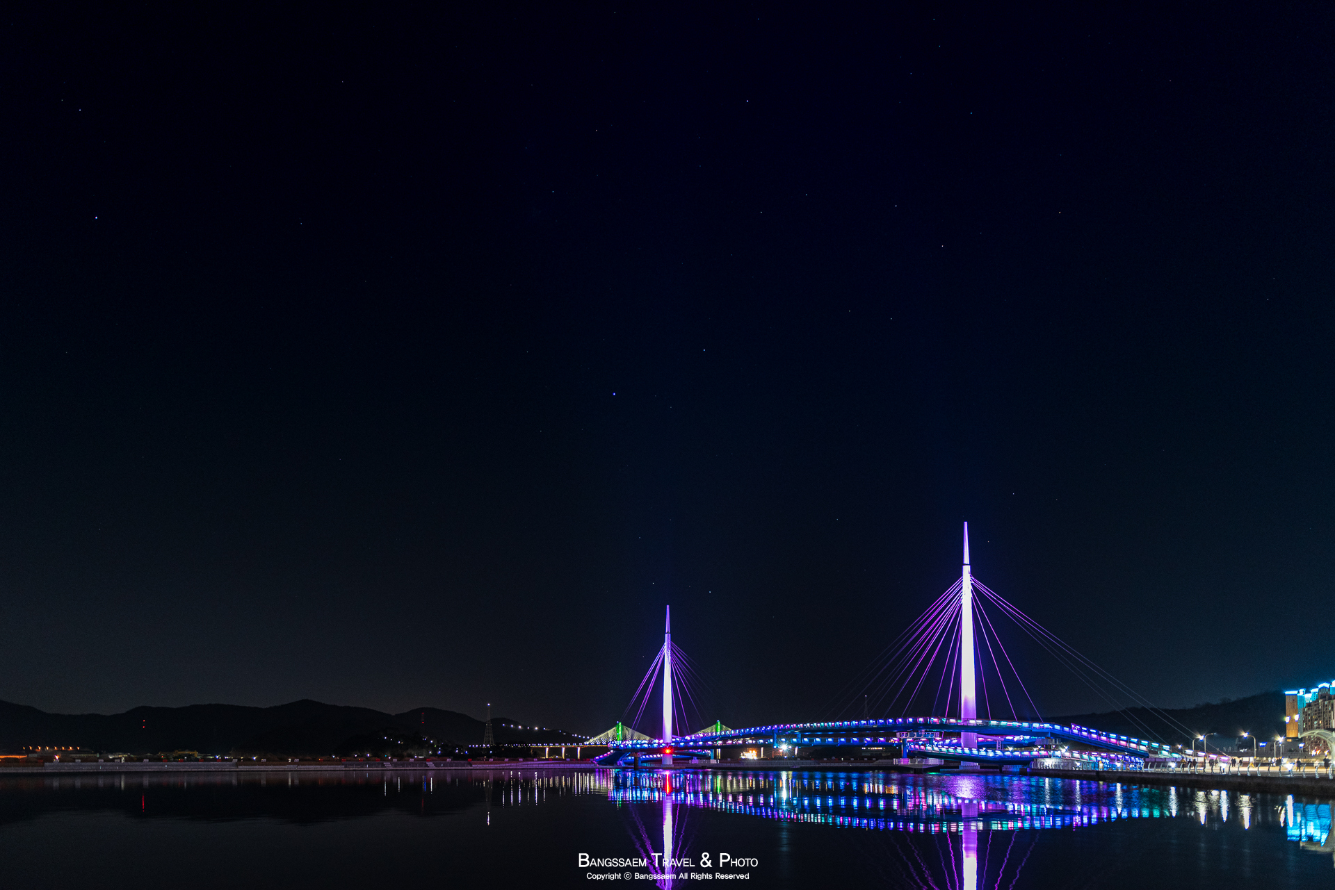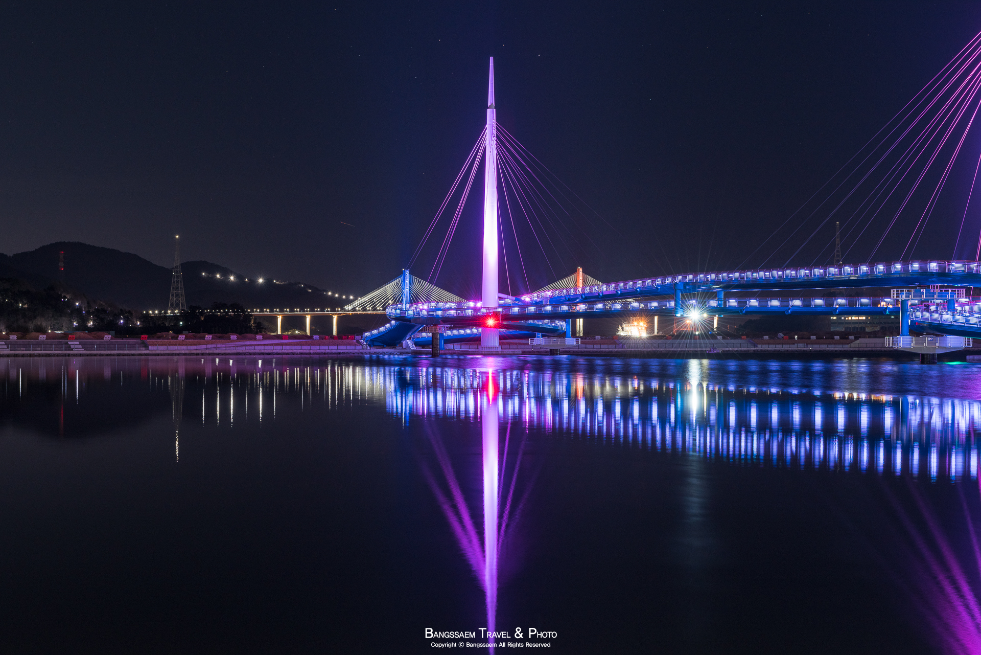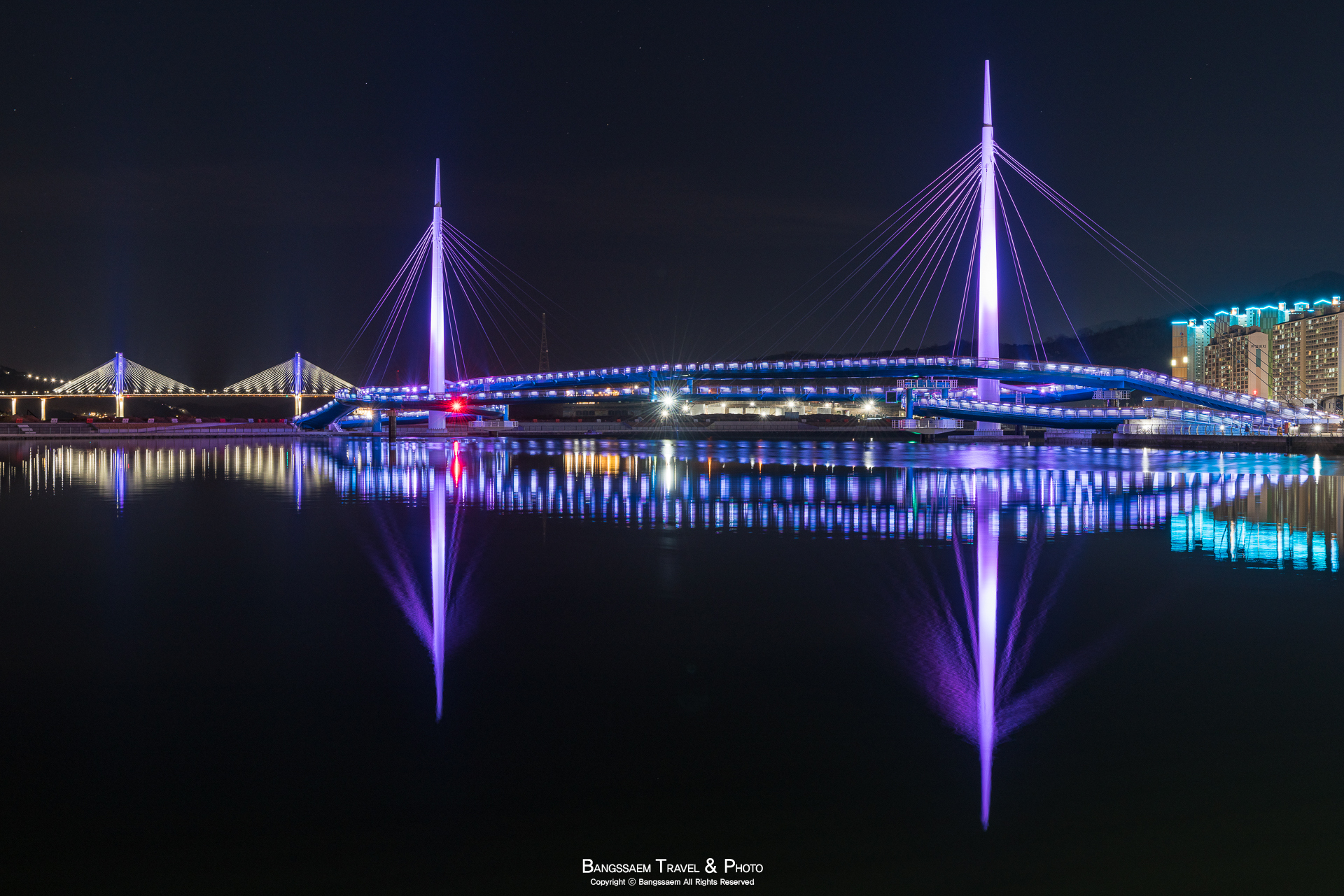 다리 기둥 조명의 색은 계속 바뀐다. 그래서 구경하는 눈도 덜 지루해지는 것 같다.
