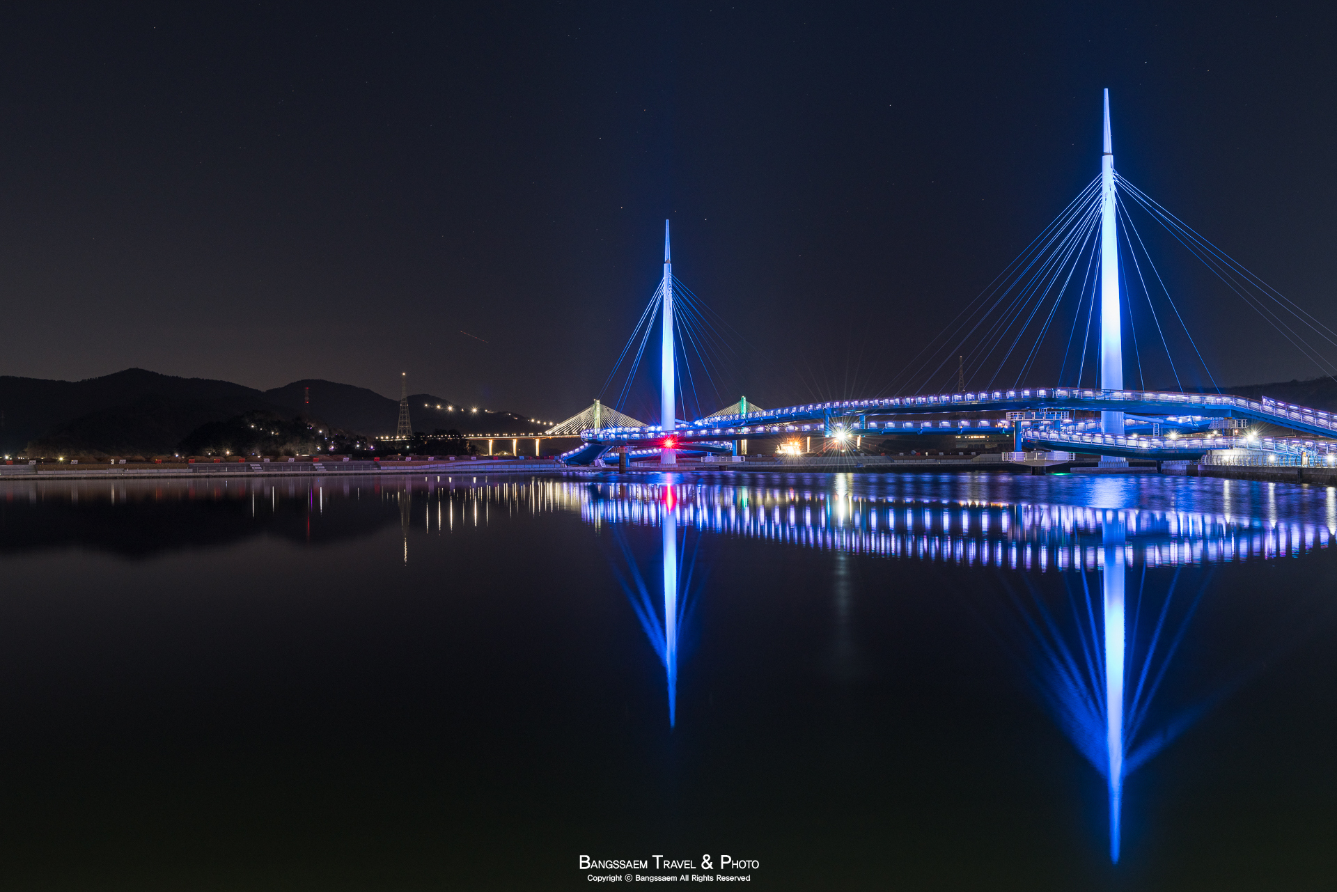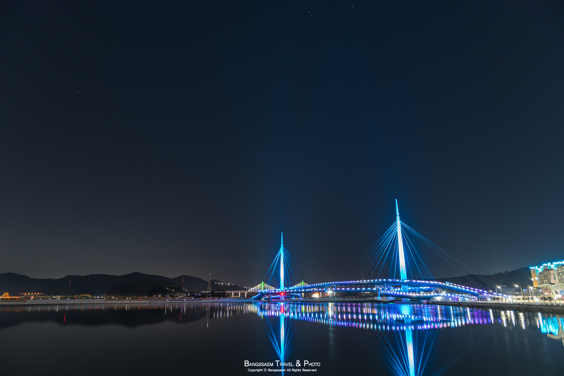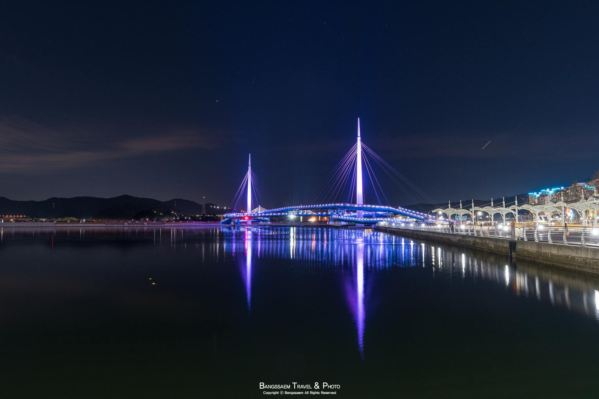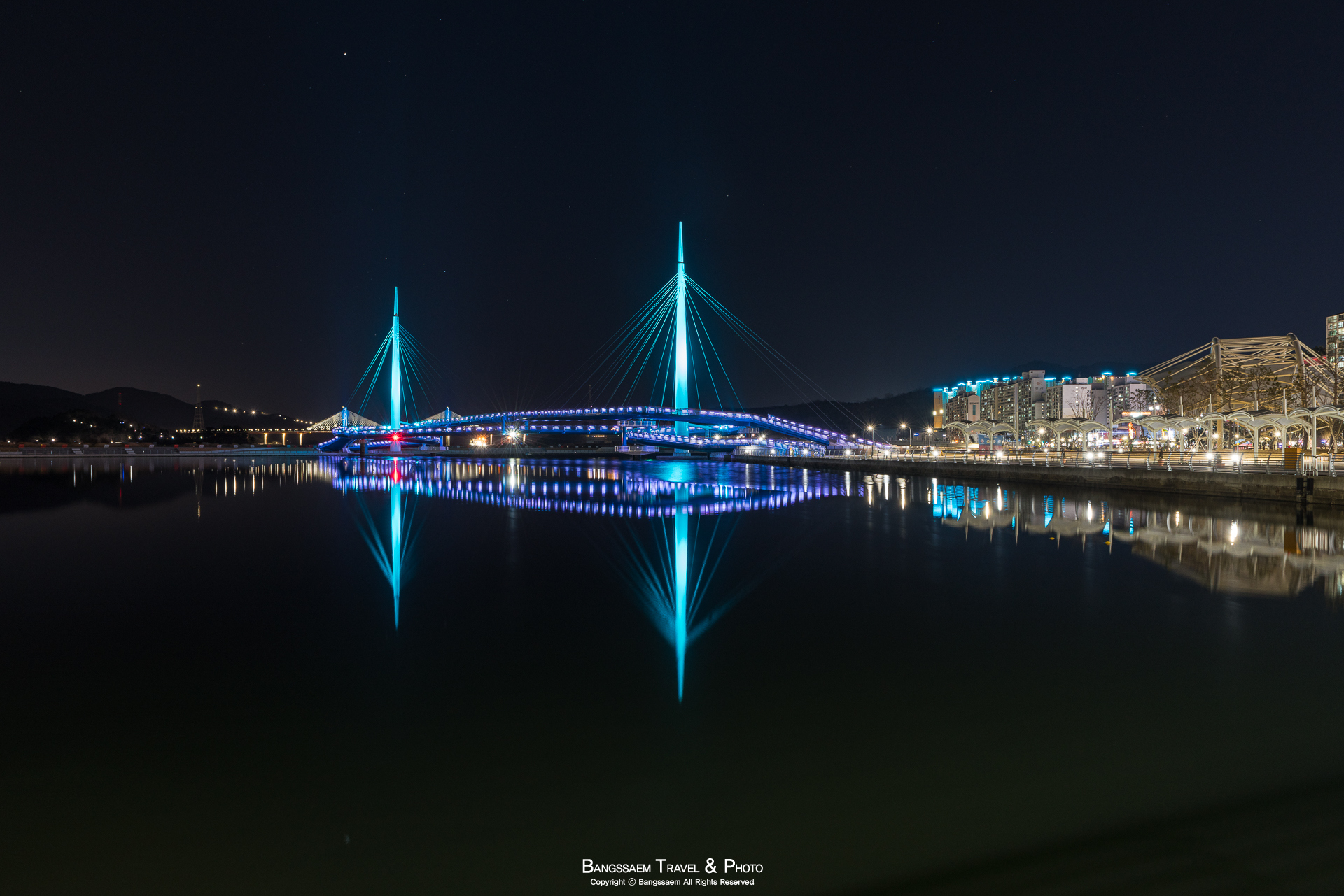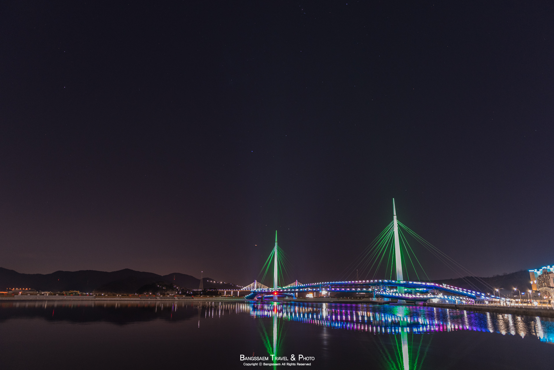 다리 기둥 조명의 색은 계속 바뀐다. 그래서 구경하는 눈도 덜 지루해지는 것 같다.